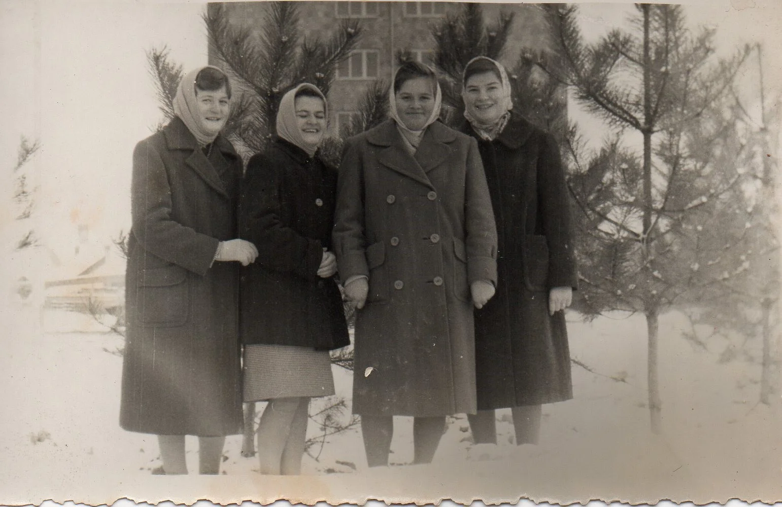Barátnők télen, a csantavéri templom kertjében