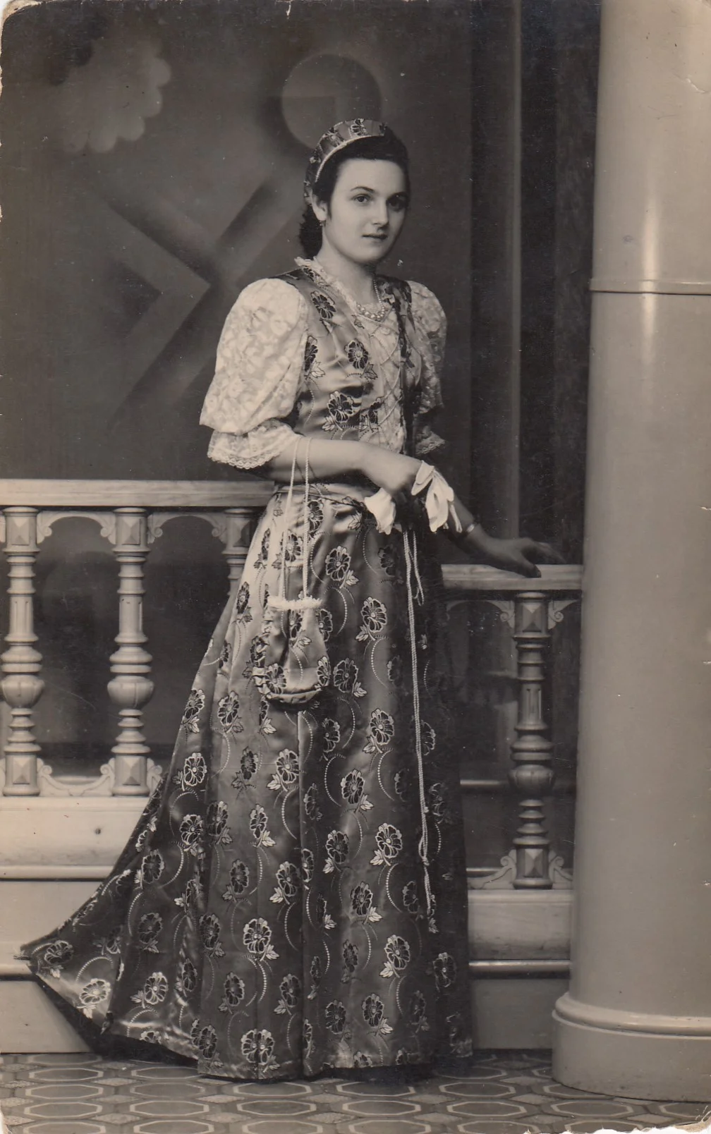 A fotó egy ünnepi, műtermi portré fiatal nőről, a vajdasági magyar közegből; a hátoldali „Apró fotograf – Sztarakanizsa” felirat alapján Magyarkanizsán készült. Hagyományőrző alkalmi öltözetet visel a hölgy. Megközelítőleg a negyvenes-ötvenes (1930-1949) években készülhetett a kép.