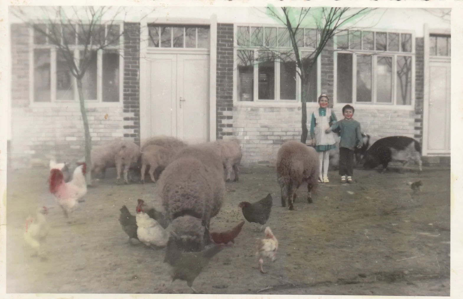 A kép Völgyesen, feltételezhetően 1960 környékén készült. Két testvérpár: Bús Monika és Bús Károly fegyelmezett, derűs nyugalomban állnak, miközben körülöttük az állatok kavalkádja tölti meg élettel az udvart. Ez az ellentét adja a kép hangulatát: egy egyszerű, időtlen pillanat a Bús tanya mindennapjából.