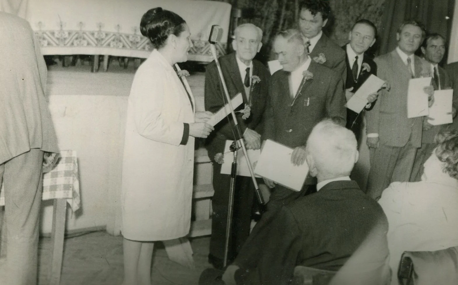 A mikrofonnál Kún-Szabó Júlia, akkori iskolaigaztatónő, Nigrényi kántor-tanító, Ömböli András, az egyesület oszlopos tagja, sok színdarab rendezője, mögötte Varga Sándor osztálytanító, Borsós Tamás zenetanár, Kerekes Lajos, zenész, Györfi Barabás, zenész.