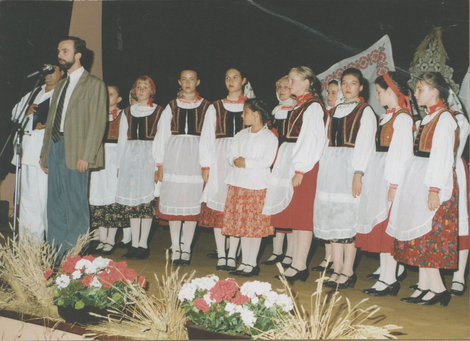 A képen az akkor városelnök - polgármester, Miković Srđan nyitotta meg a Hertelendyfalvi Arató Napok rendezvényt, amelyet akkor a hertelendyfalvi Emlékotthonban tartottak meg. Első napon, pénteken este három nyelvű művelődési műsort szerveztünk, lisztből készült süteményeket, kalácsokat állítottak ki a pékségek, magánszemélyek. A polgármester mögött a Tamási Áron Székely-Magyar Művelődési Egyesület asszonykórusa és leánykórusa látható, főként felsőosztályosok és középiskolások.