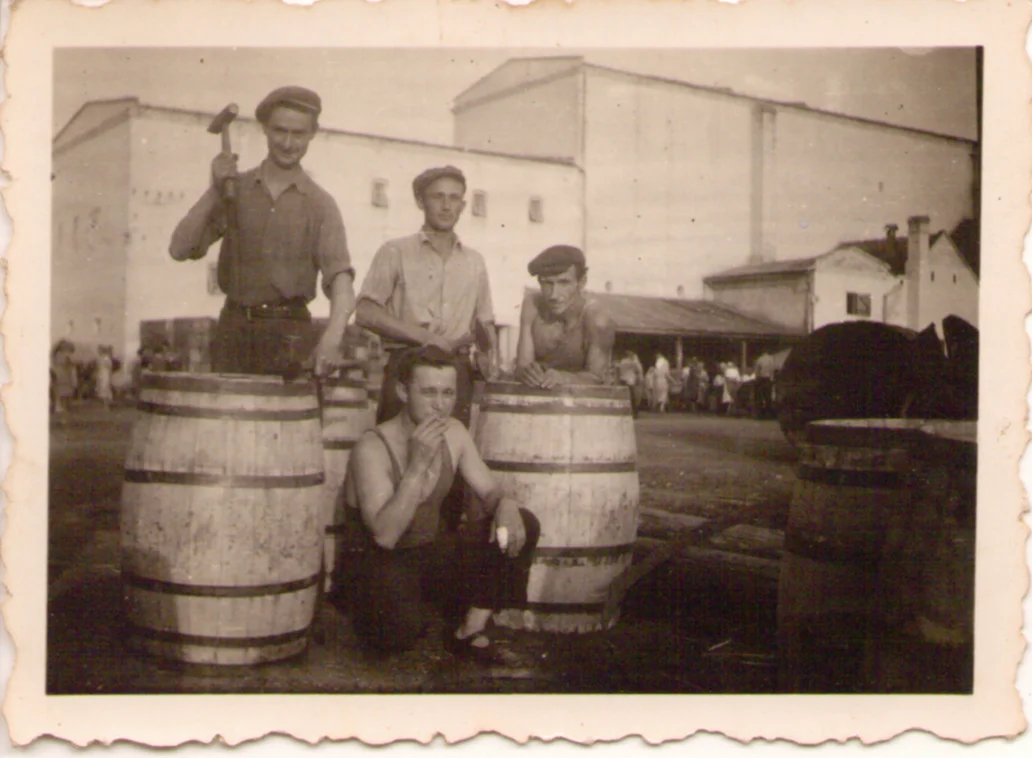 A képen Szórád Gyula (Zenta 1927-2017) kádármester látható, munkatársaival, az akkori moholi zöldség konzervgyár udvarán, ahol akkoriban dolgozott.