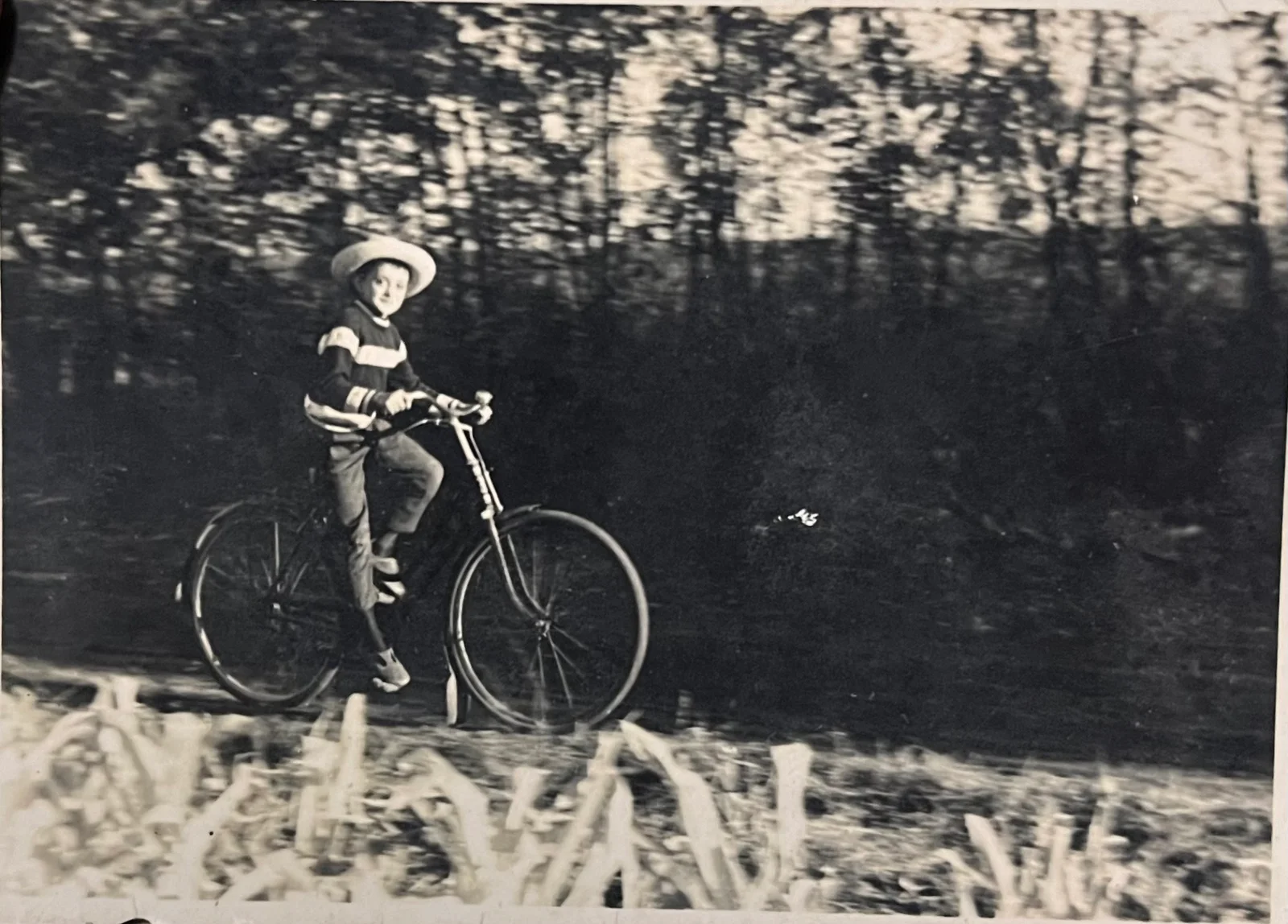 Kisfiú biciklizik a tanya mellett