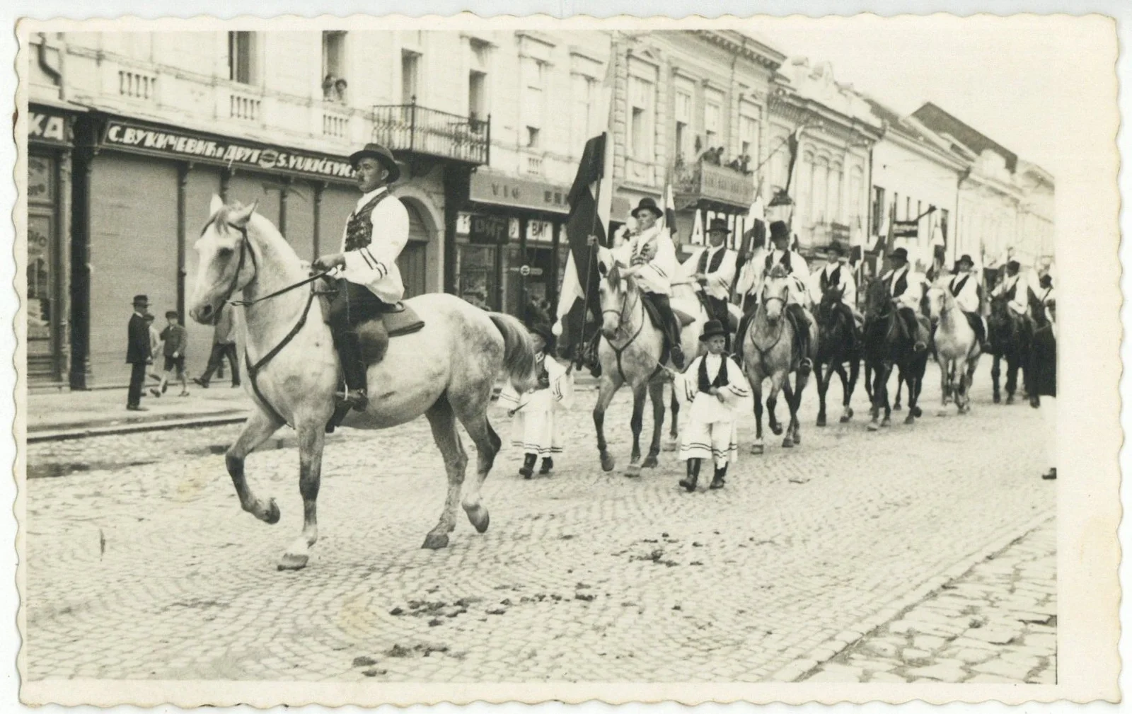A doroszlói Gazdakör lovasbandériumának felvonulása Zomborban