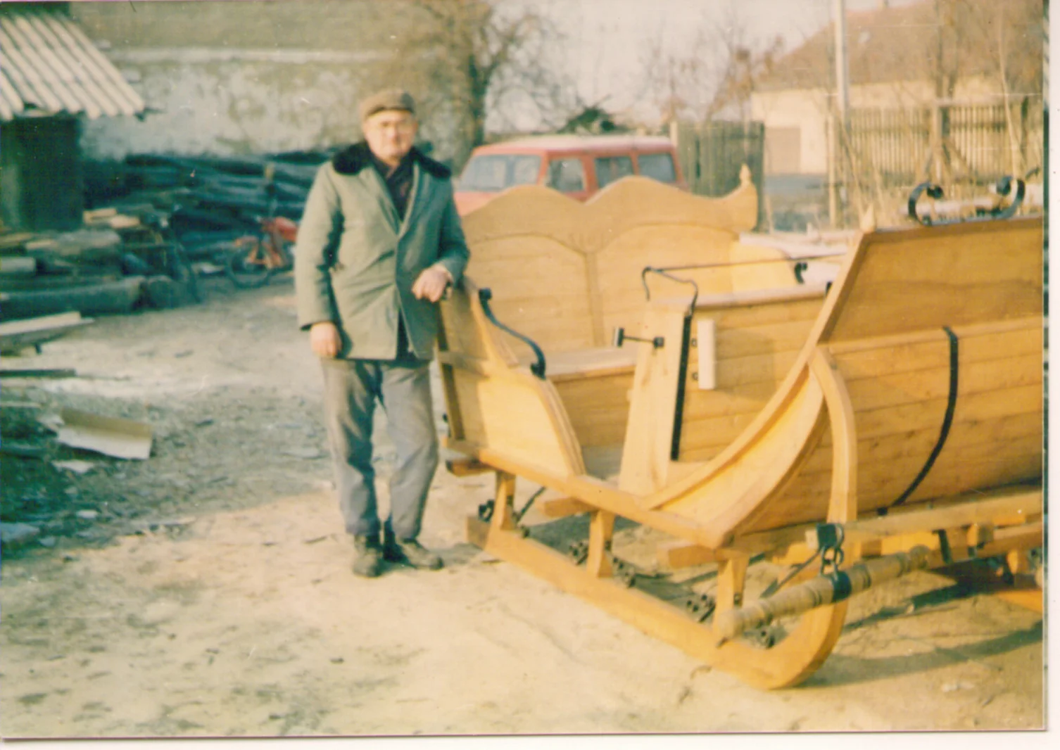 A képen Szórád Gyula (1927-2017) látható az általa készített (faszerkezet) díszes lovas szánkóval. Eredeti szakmája kádármester volt, de a bognár szakmában is jártas volt. A szánkó egy külföldi, akkoriban Jugoszláviában forgató filmes cég megrendelésére készült a cégben, ahol dolgozott.