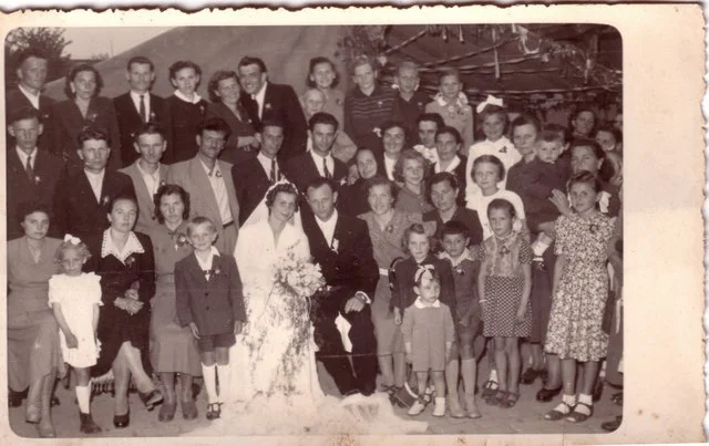 Bajtai Lajos és ( szül. Bite) Rózsa lakodalma. Vendégekkel a lakodalamas sátor előtt.