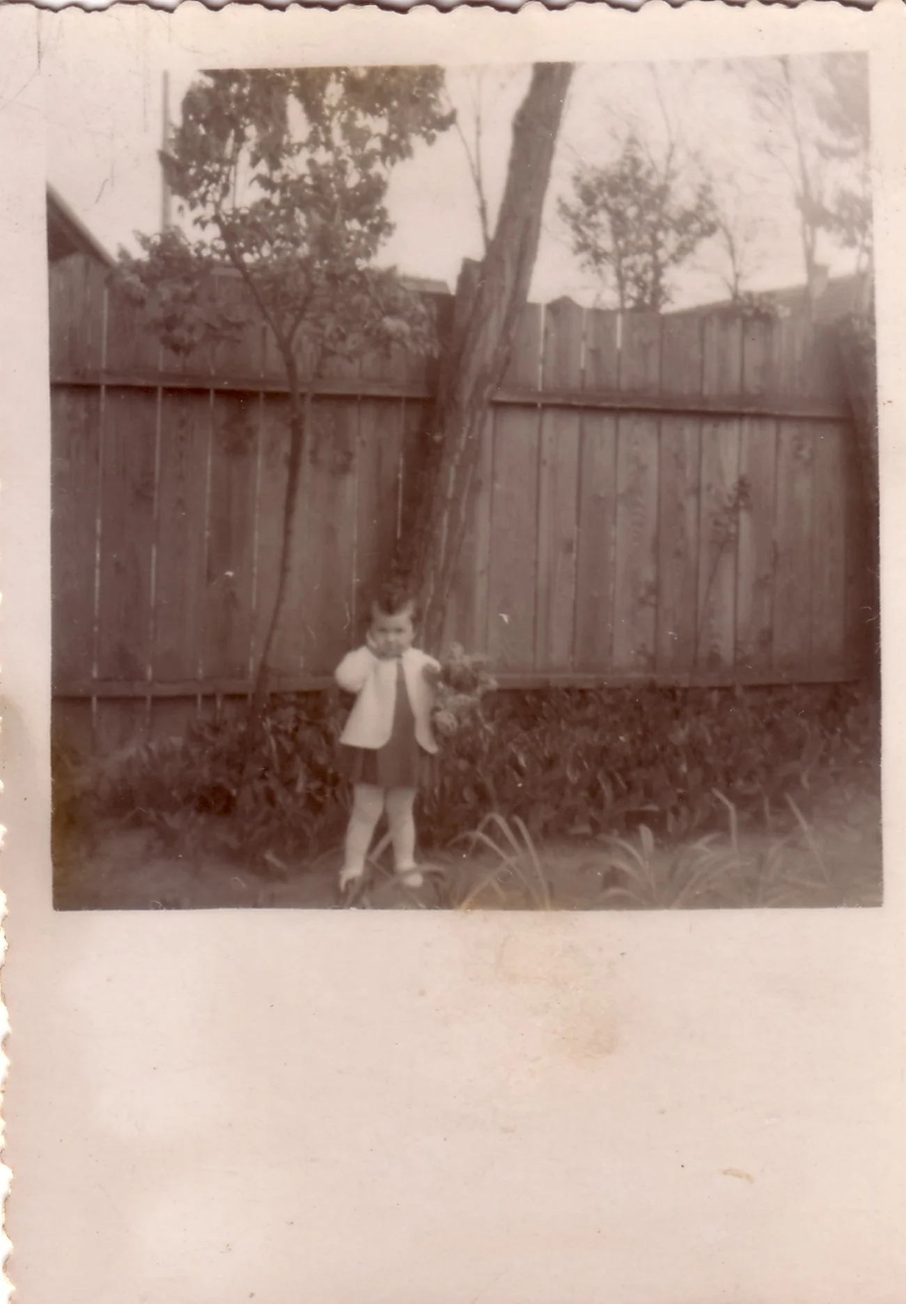 Kislány a deszka kerítésnél