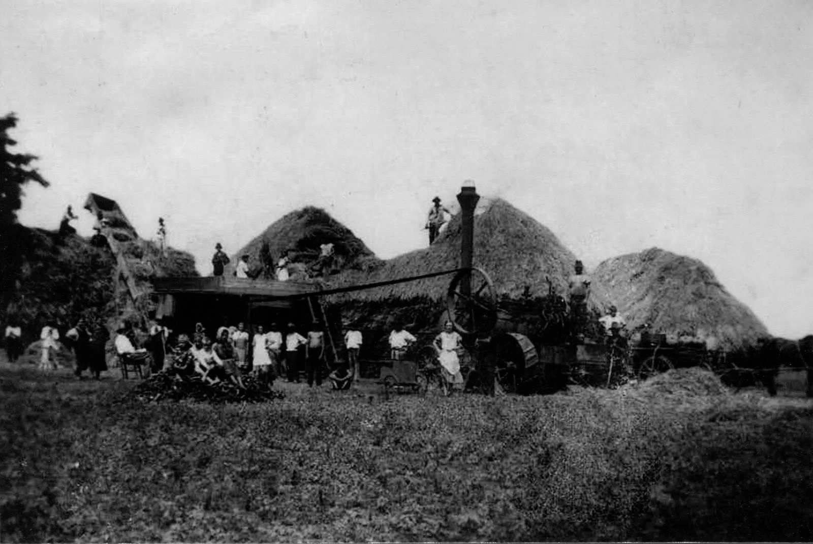 Tüzes-cséplőgéppel való cséplés egy tanyán az 1800-as évek végén.