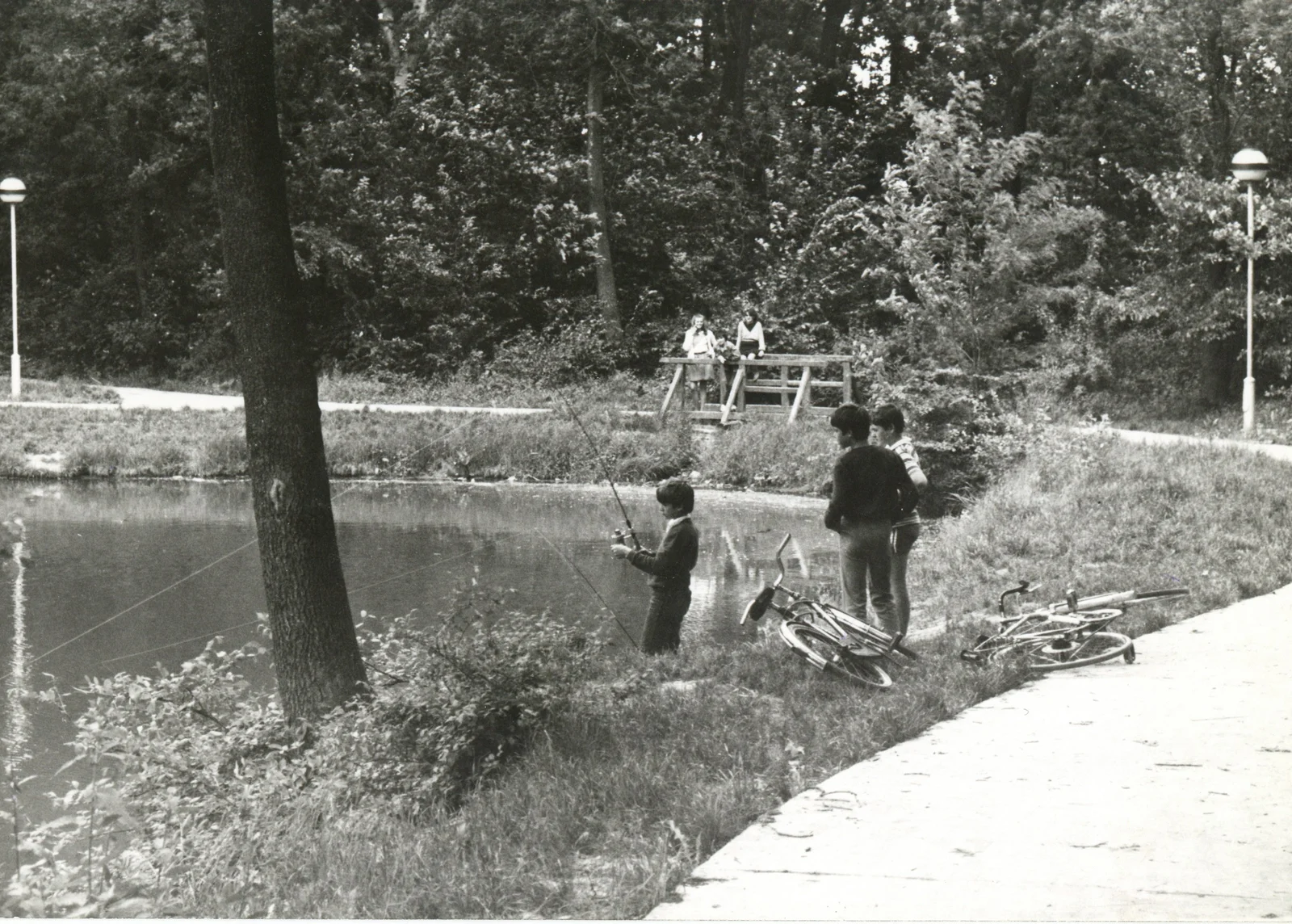 Horgászó gyerekek a park tavánál