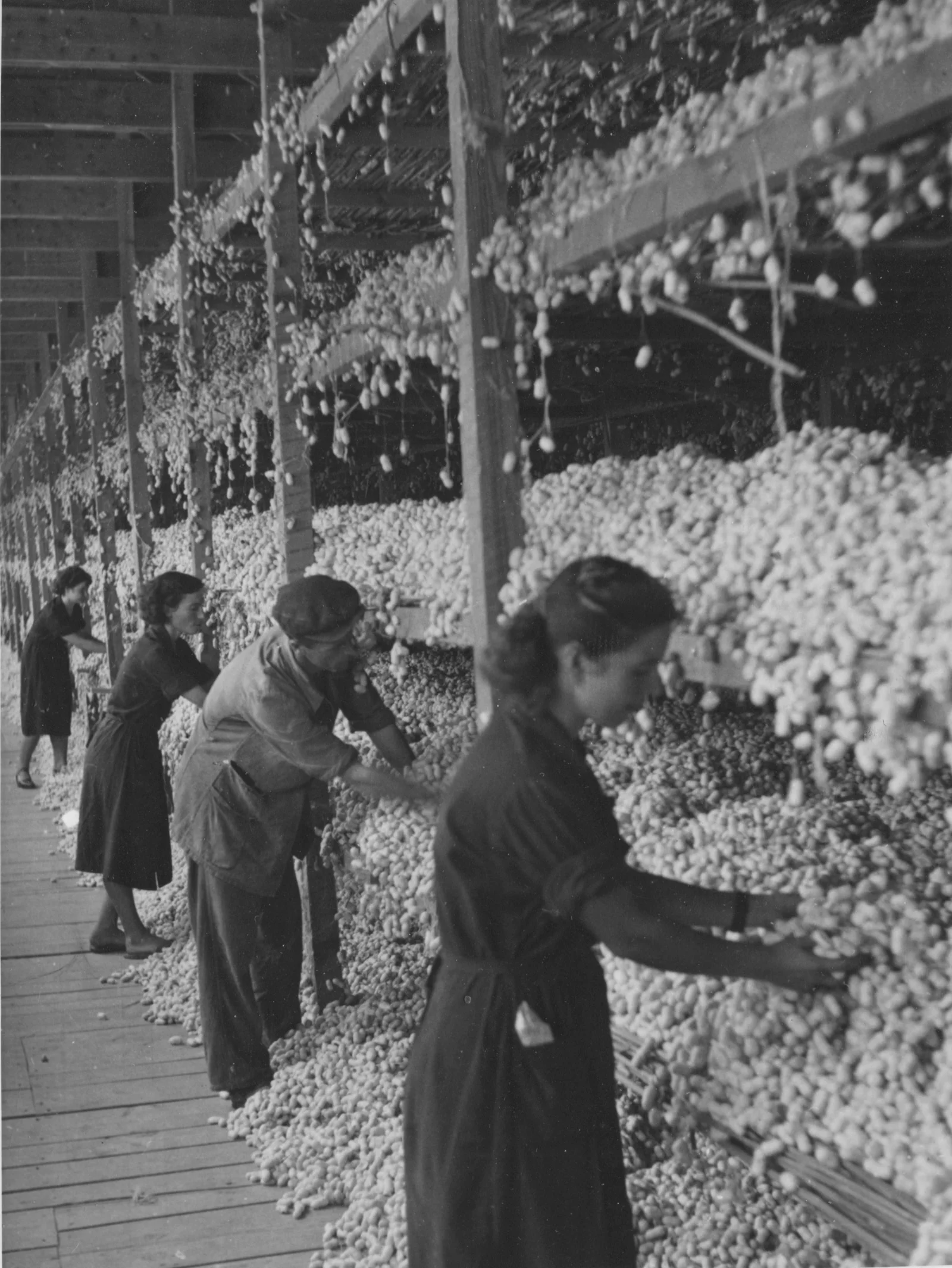 Selyemgubókkal dolgozó munkások