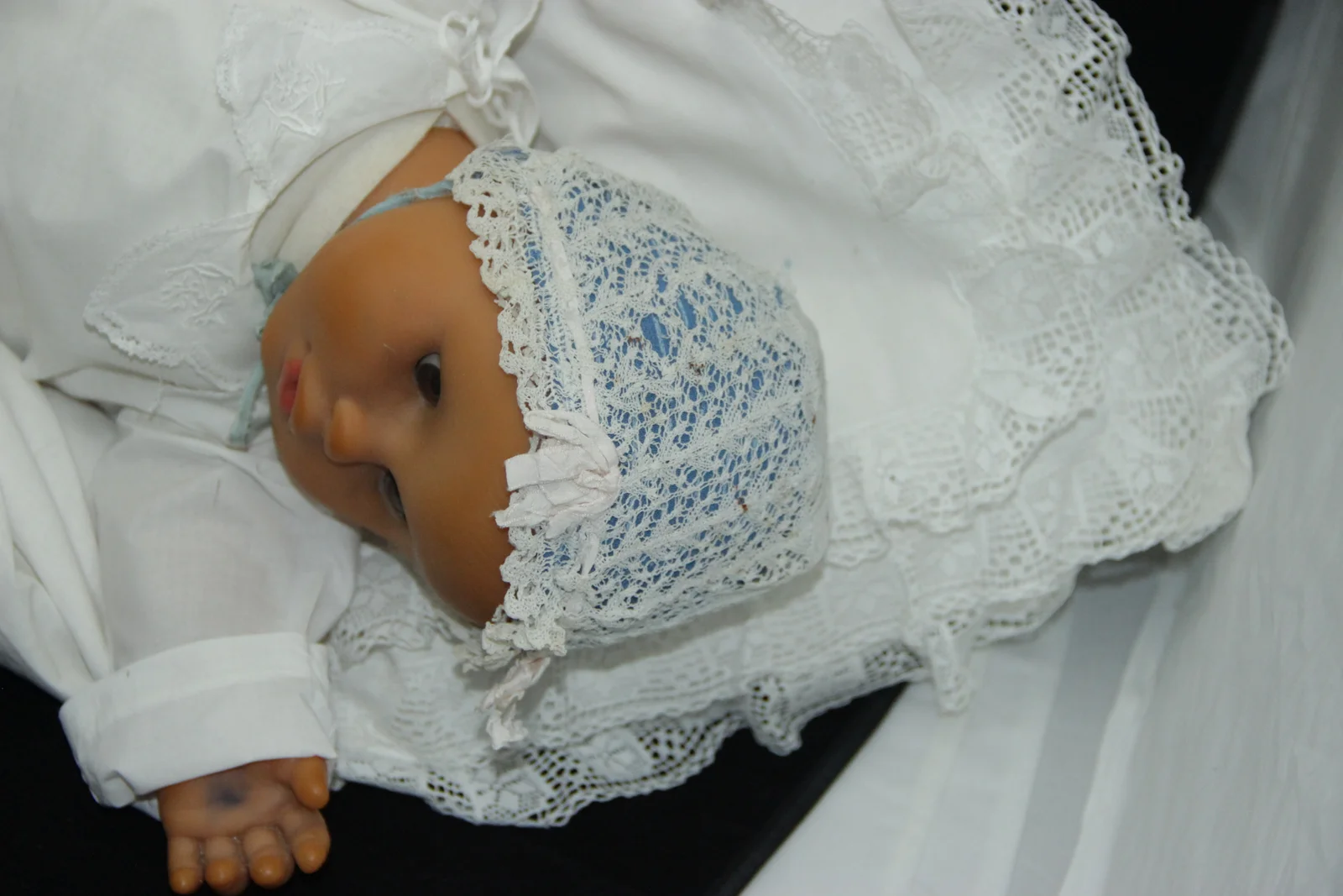 Leírás: Kék selyem alapra varrt fehér kötöttcsipkéből.
