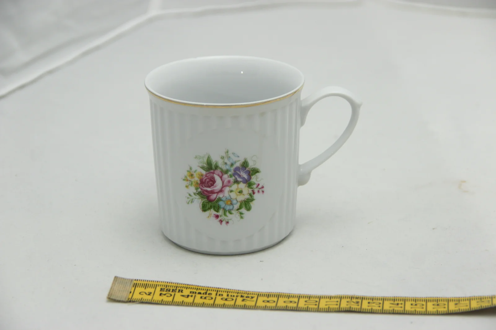 Leírás: Mintája mindkét oldalon virágcsokor rózsával és vegyes virágokkal. A bögre fala bordázott, kivéve a virágminta felületét. Fenékjegye: "APULUM FINE PORCELAIN" koronás címerrel.