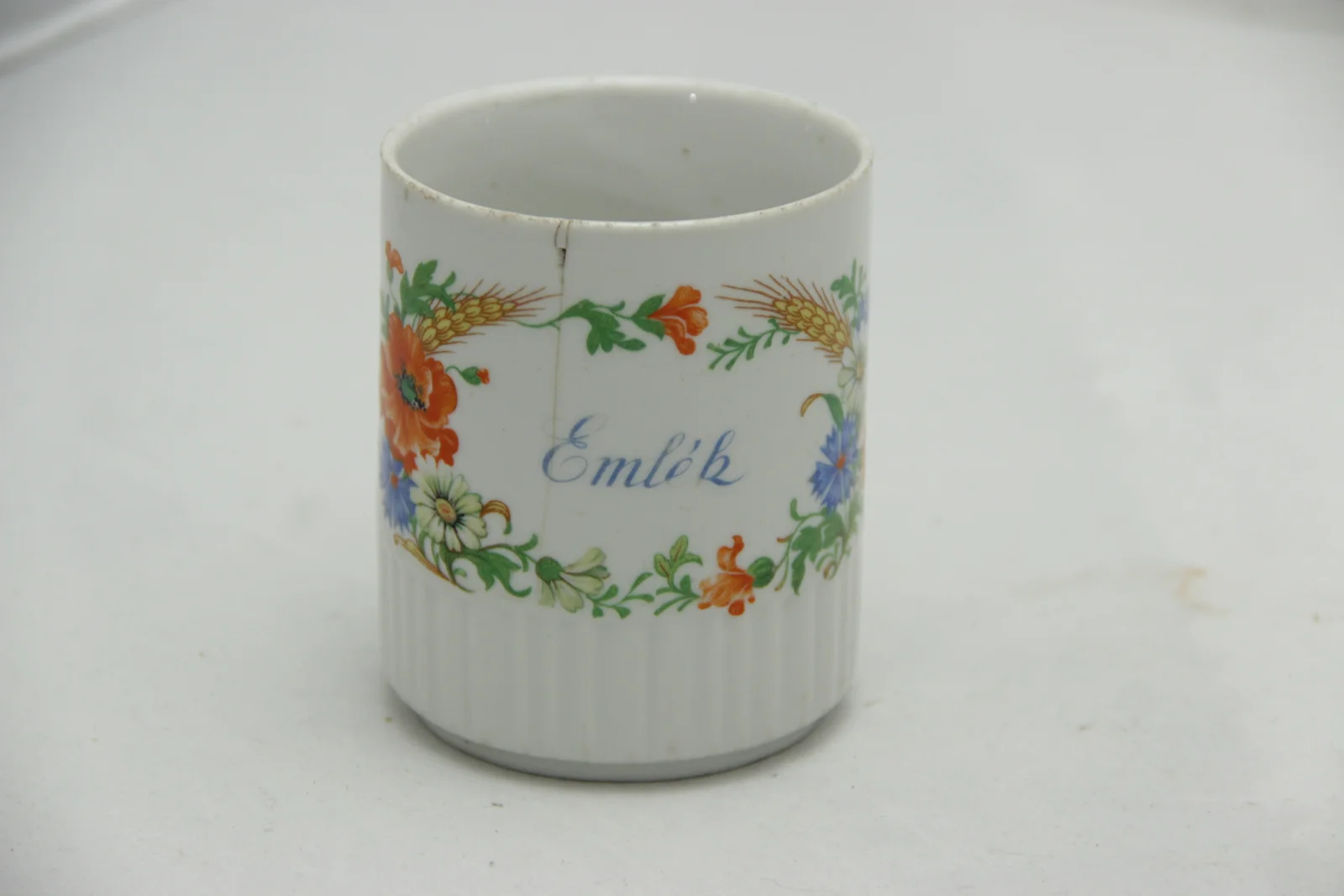 Leírás: Mintája: "Emlék" felirat vadvirág-koszorúba foglalva. Füle letört. Fenékjegye: "30 ZSOLNAY PÉCS"