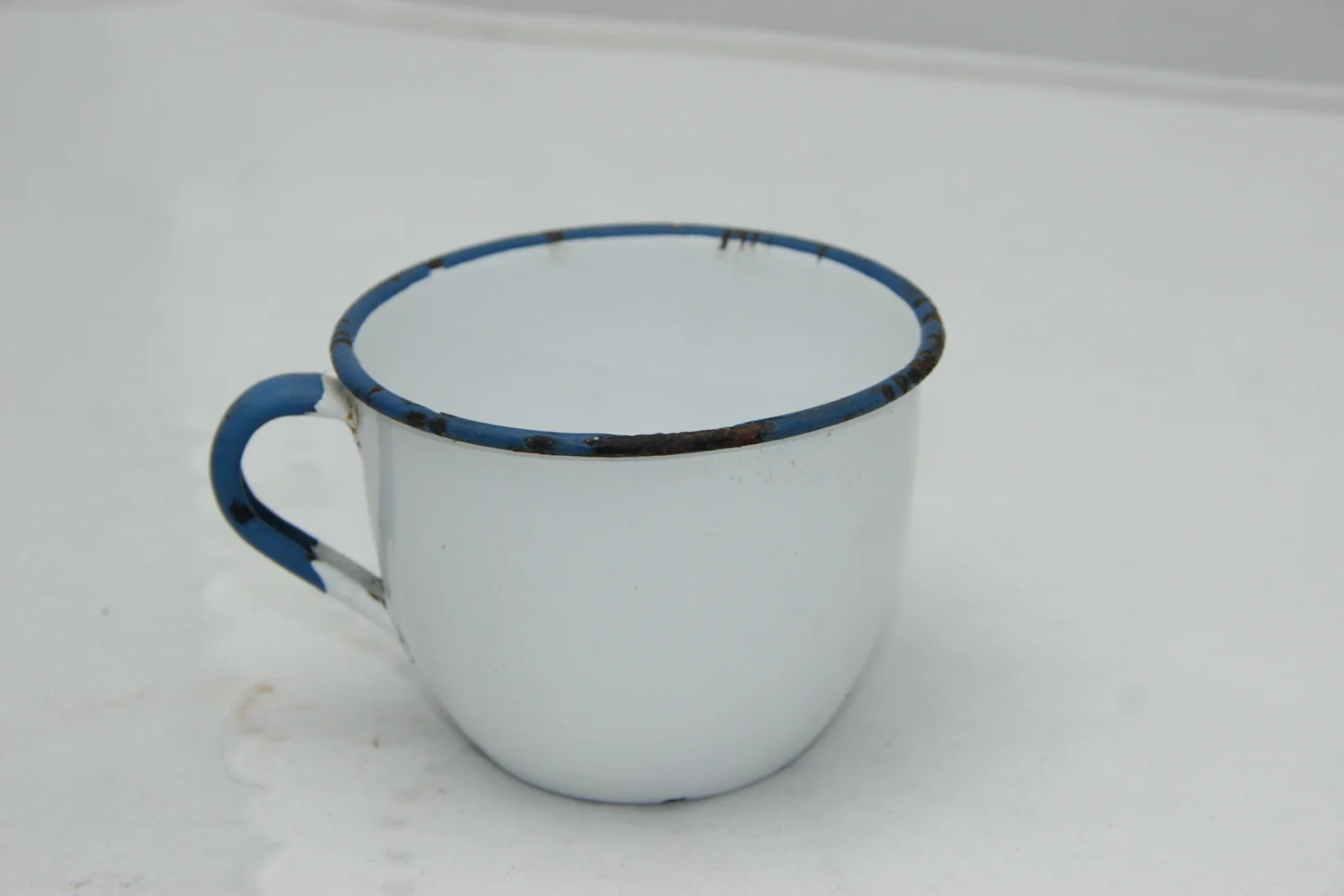 Leírás: Fehér színű, öblös. Füle és szájpereme kék.