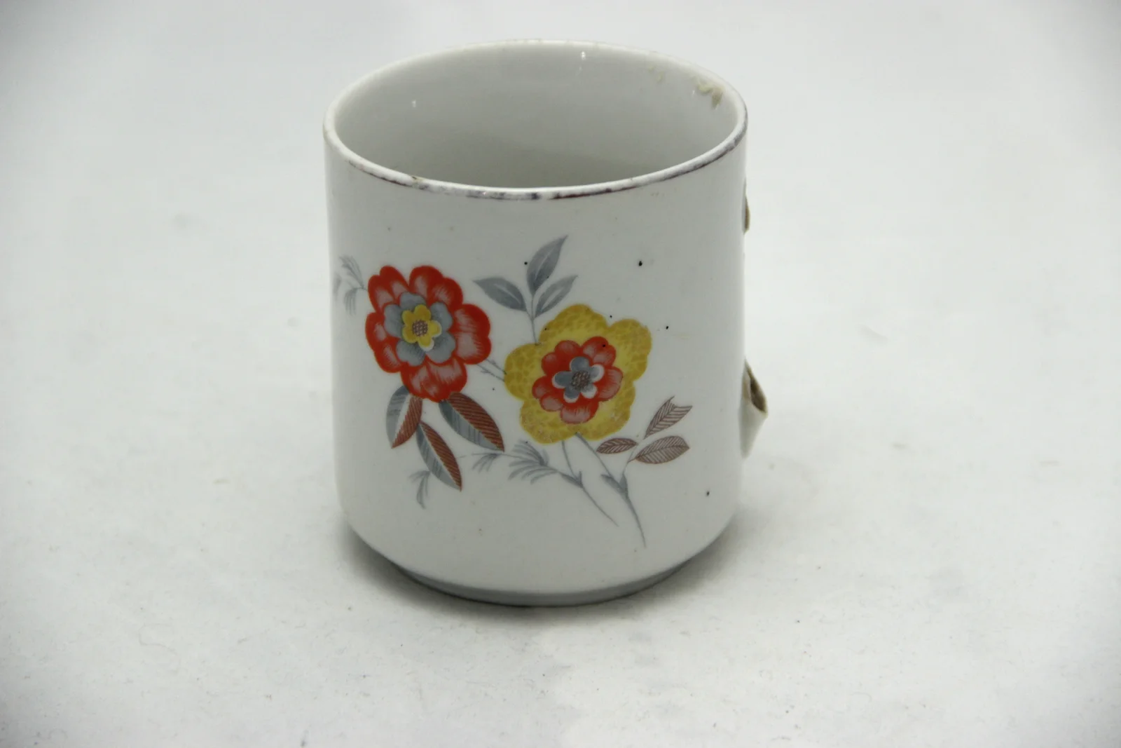 Leírás: Mintája fehér alapon sárga és piros virág. A füle letört. Fenékjegye: "FPM NS"