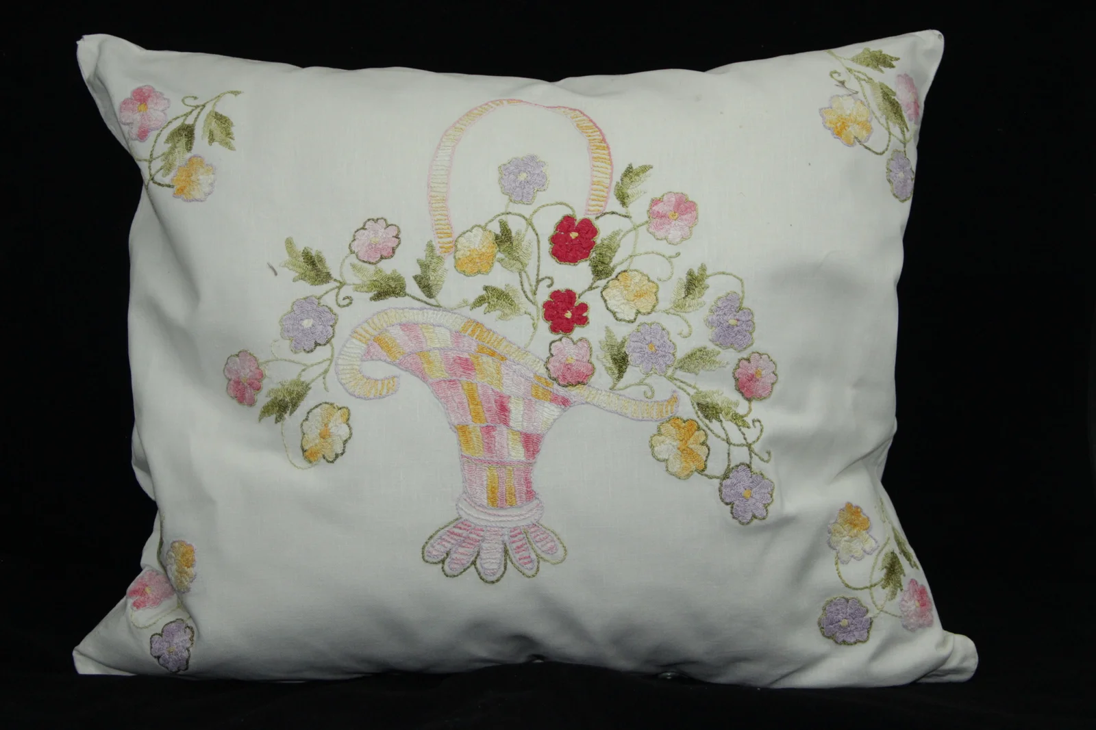 Leírás: Színes satírozott hímzőcérnával készült. Mintája virágkosár.