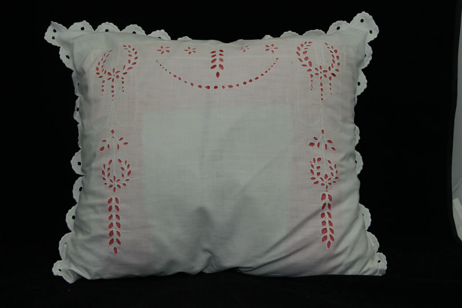 Leírás: Lyukhímzéses díszítéssel. Mintája oszlopos, koszorús. A levélforma dominál. Kerek cakkos (rózsacakk), benne egy lyuk.