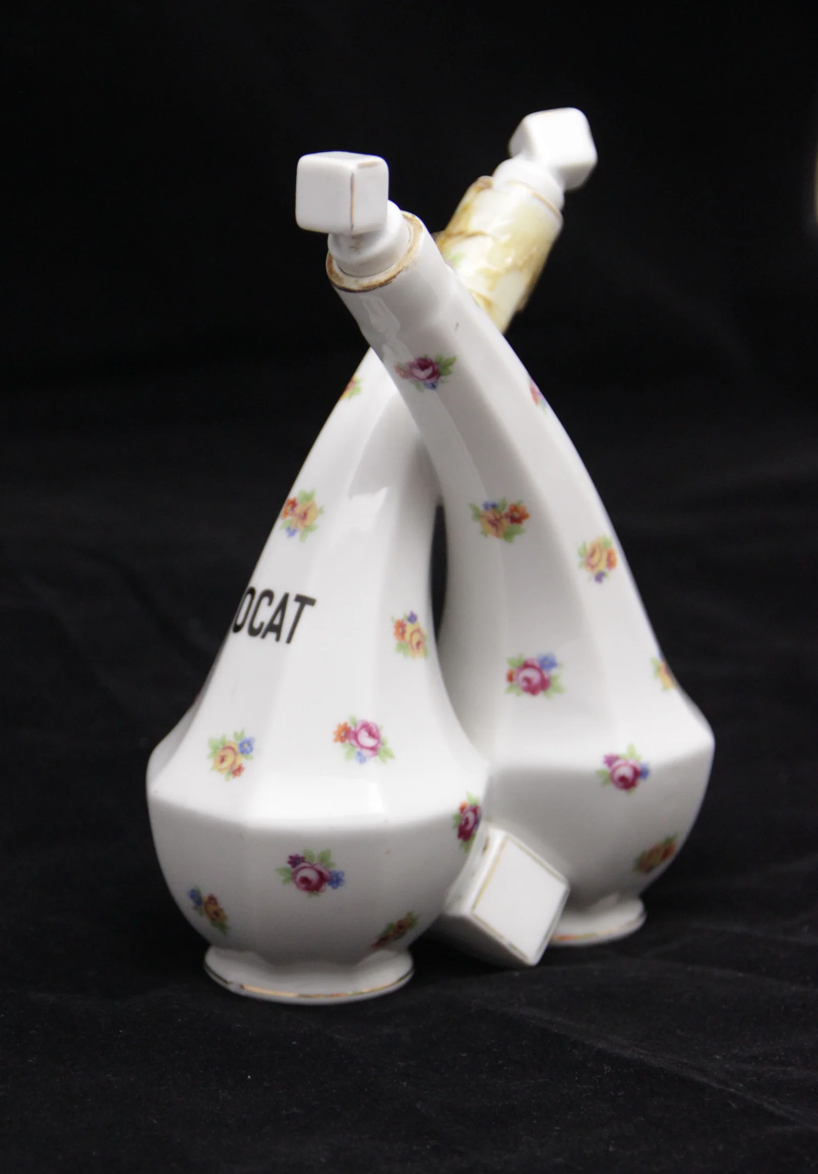 Leírás: A két hosszúnyakú edény keresztben összeér. Porcelándugóval záródnak. Fehér alapon rózsamotívumokkal. Fenékjegye: Victoria, 361. Felirata: OCAT, ULJE.