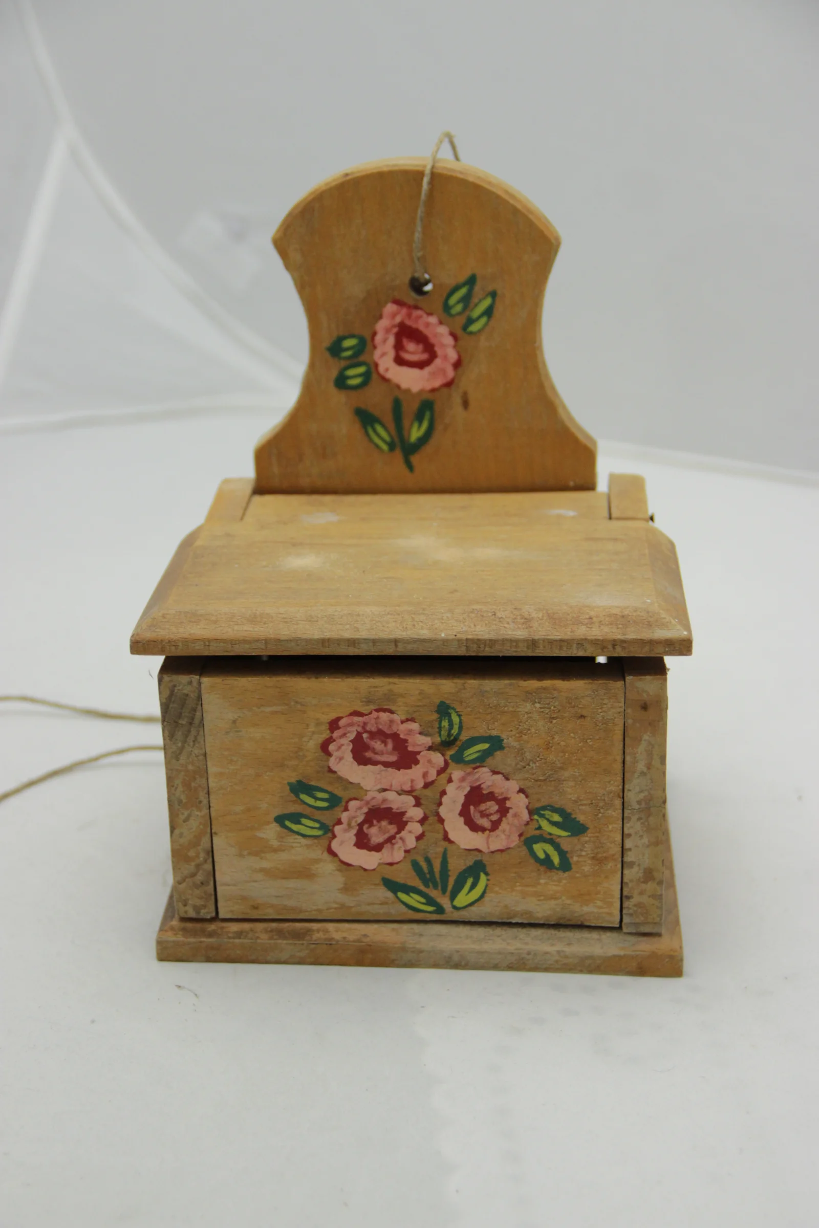Leírás: Fedeles, falra akaszható sótartó. Virágokkal díszített.