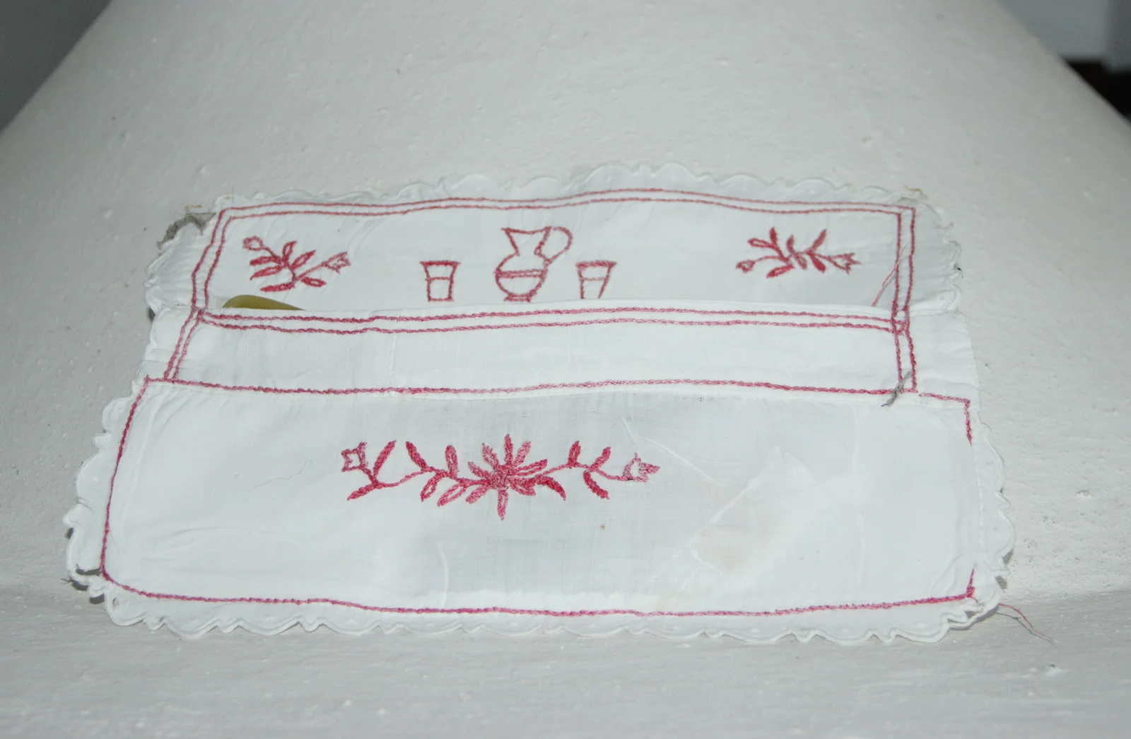 Leírás: Fehér vászon alapanyagra, piros (kifakult) hiímzőfonállal hímezve. Motívumai: kancsó és pohár, alul stilizált tulipánok és levelek. Egyzsebes.