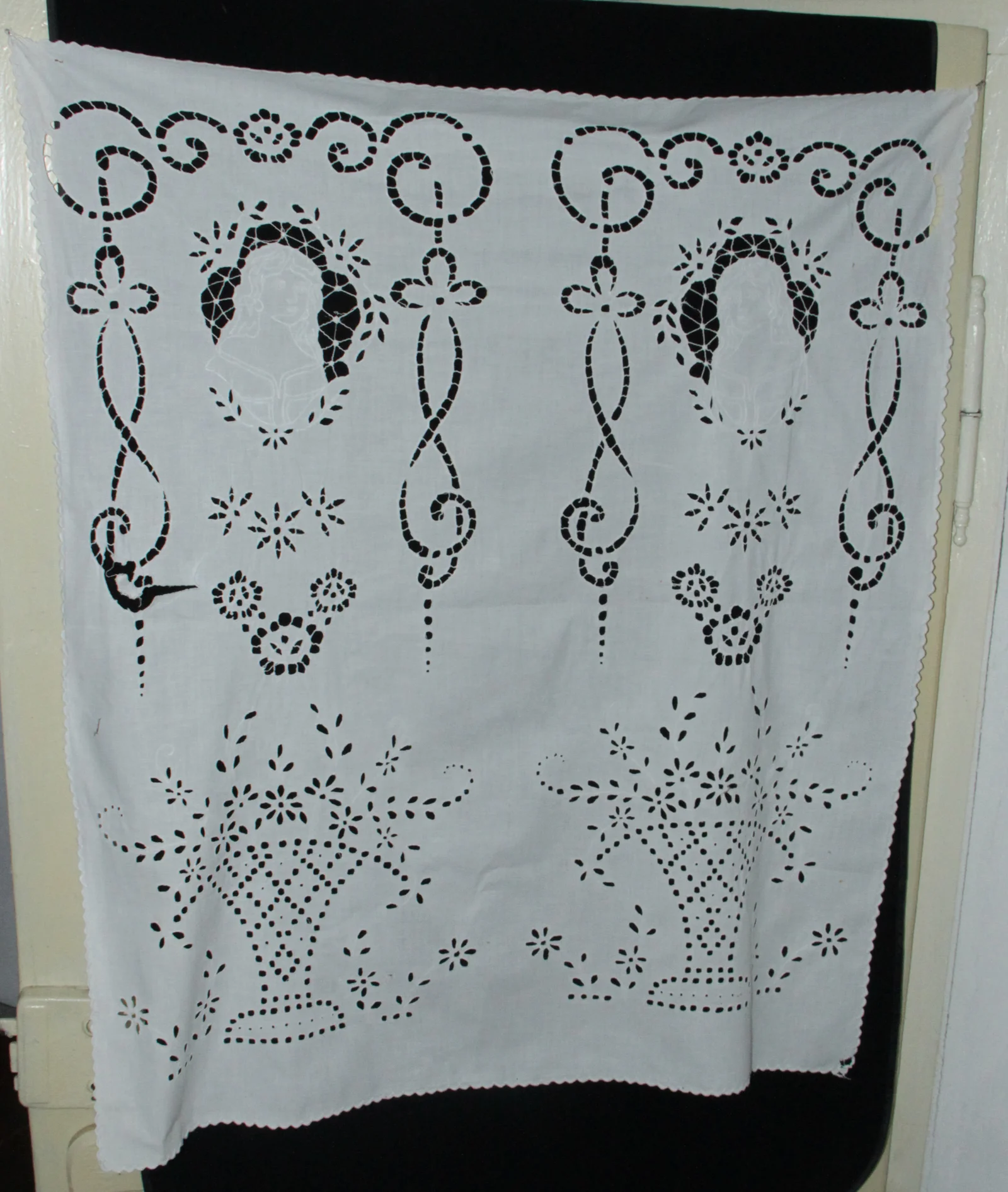 Leírás: Kombinált riseliő és madeira hímzéssel. A riseliő motívuma női fej (körülötte póklábas technika). A madeira motívuma violinkulcsra emlékeztet. Alul kosárba rendezett virágok lyukhímzéssel.