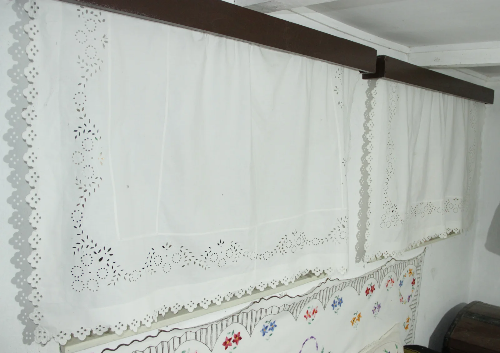 Leírás: A fehérhímzés jellegzetes technikái láthatóak a tárgyon: apró lyukhímzés kisebb és nagyobb lyukakkal, levelek lyukhímzéssel. Az 1910-es évek mintakincsének jellegzetes motívumai: ismétlődő sordísz, apró lyukakból álló, kör alakba rendeződő virágok és levelek ismétlődnek. A sarokminta 5 elemből áll. 5 kisebb cakkból állnak a cakkok, bennük 4 lyukkal.