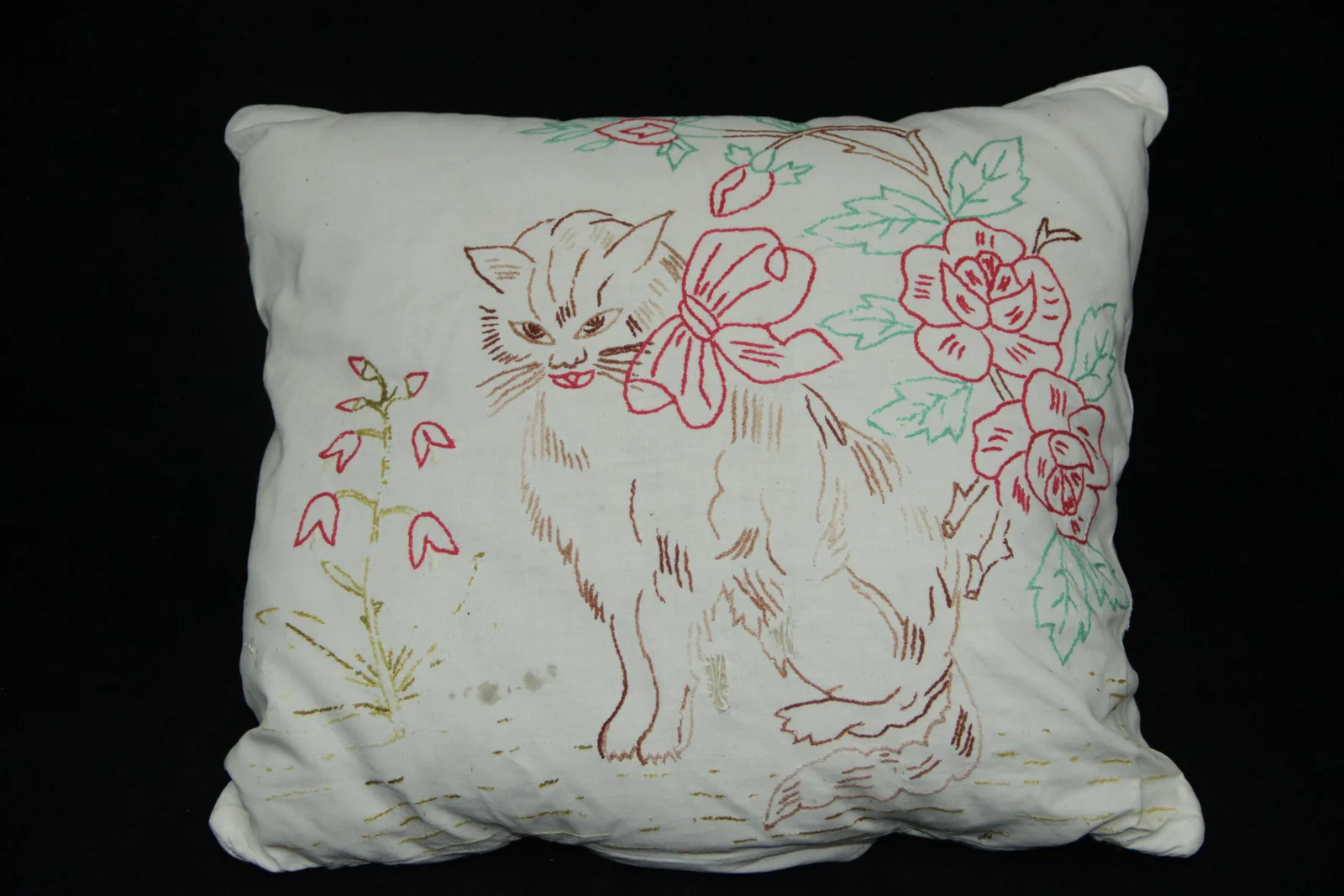 Leírás: Motívumai: cica, rózsa, harangvirág. Száröltéssel kihímezve. Színei: piros, zöld, barna.