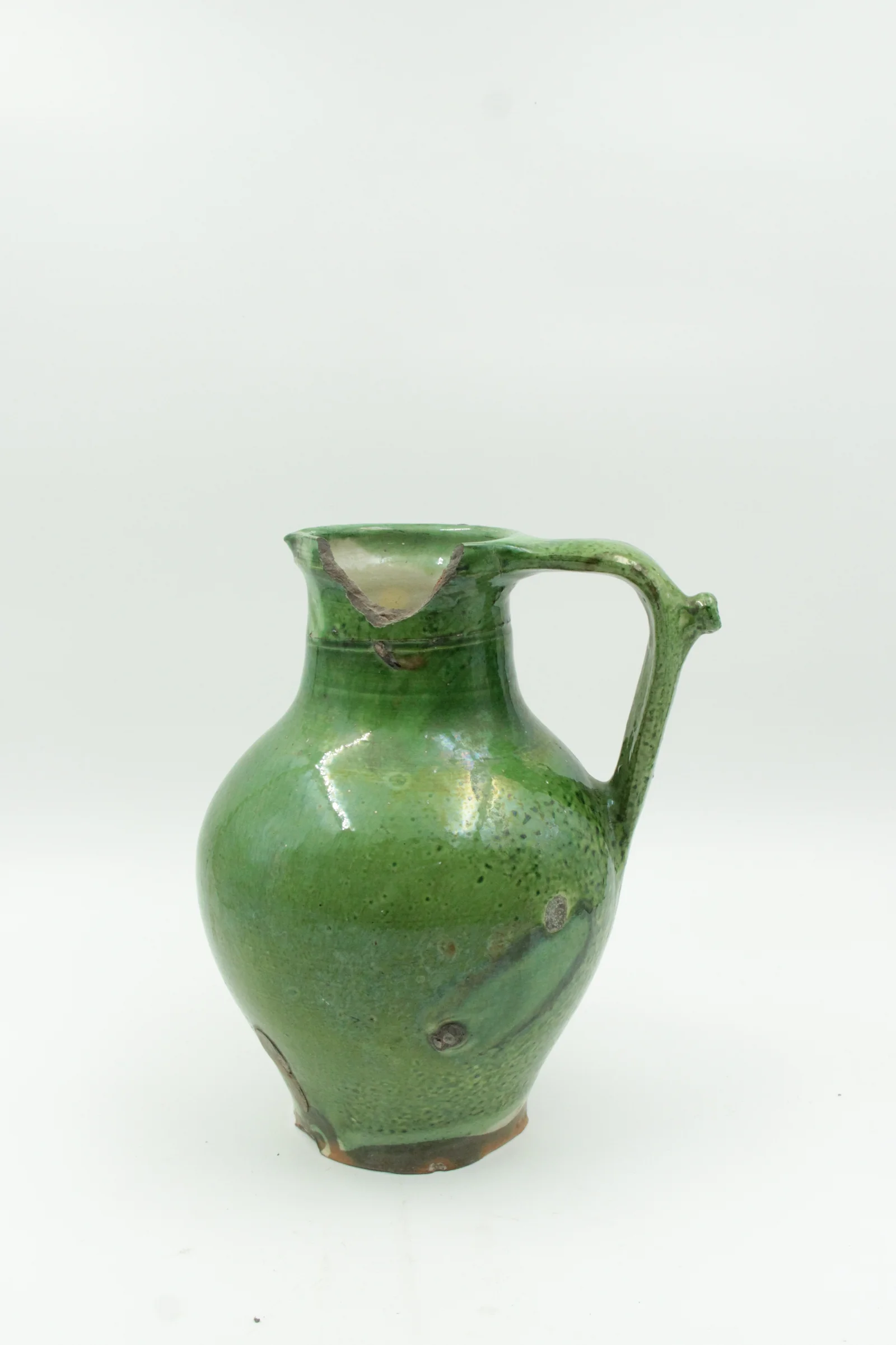 Leírás: Zöld mázas, szája sérült. Fülén kiöntőcsűcs.