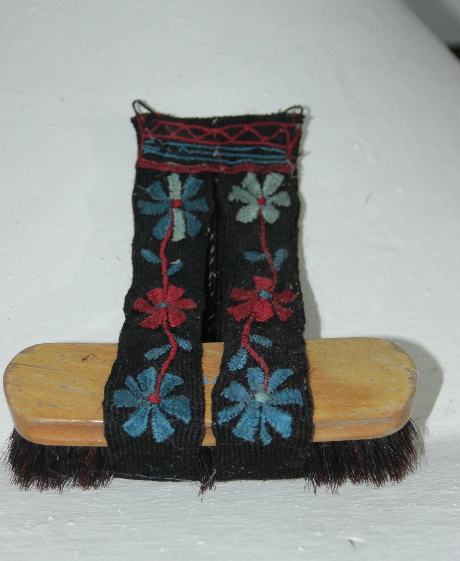 Leírás: Két fekete szövött szalagból álló tartórész. Díszítése: hamislaposöltéses kék és piros virágok.