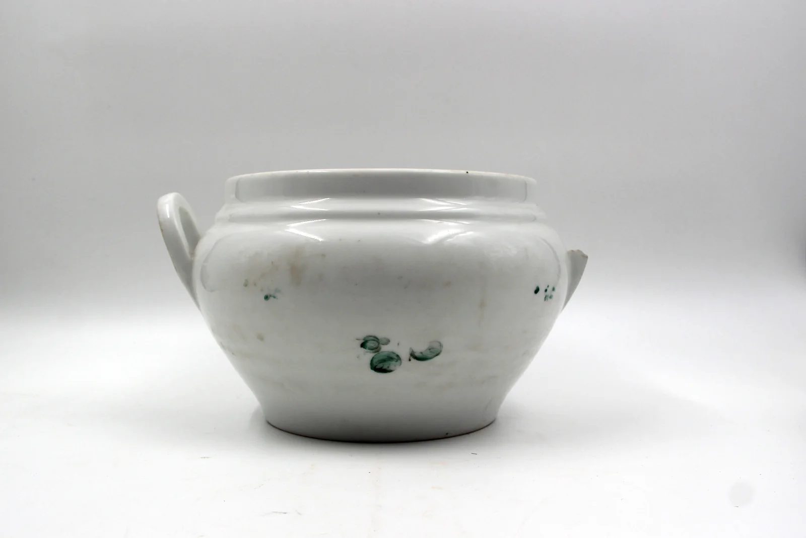 Leírás: Egyik füle letört. Zöld leveles, kopott mintája van.