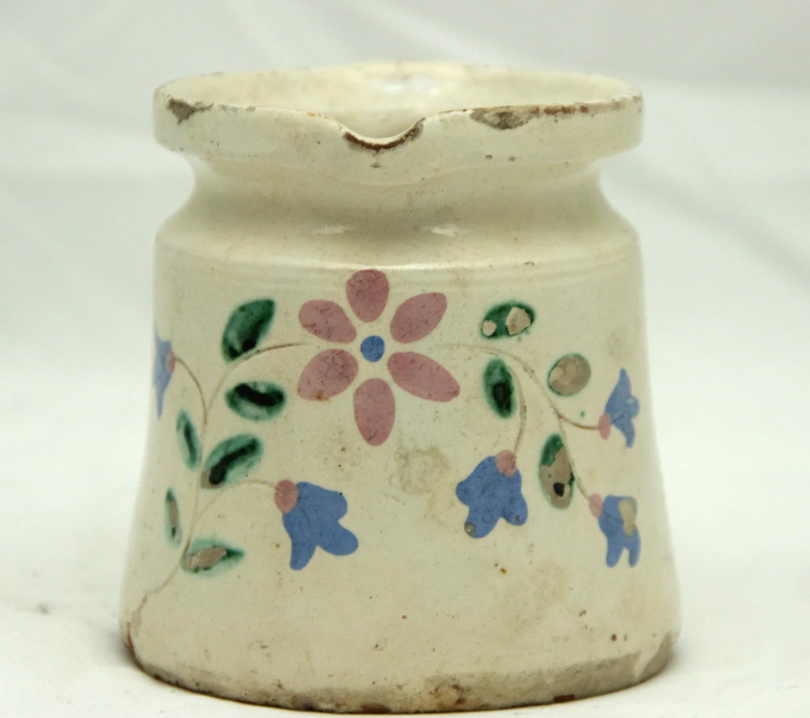 Leírás: Vajszín alapon karcolt és irókázott virágminta (színei: rózsaszin, zöld, kék). Egy lyuk található az alján. Kiöntőcsűcsös.