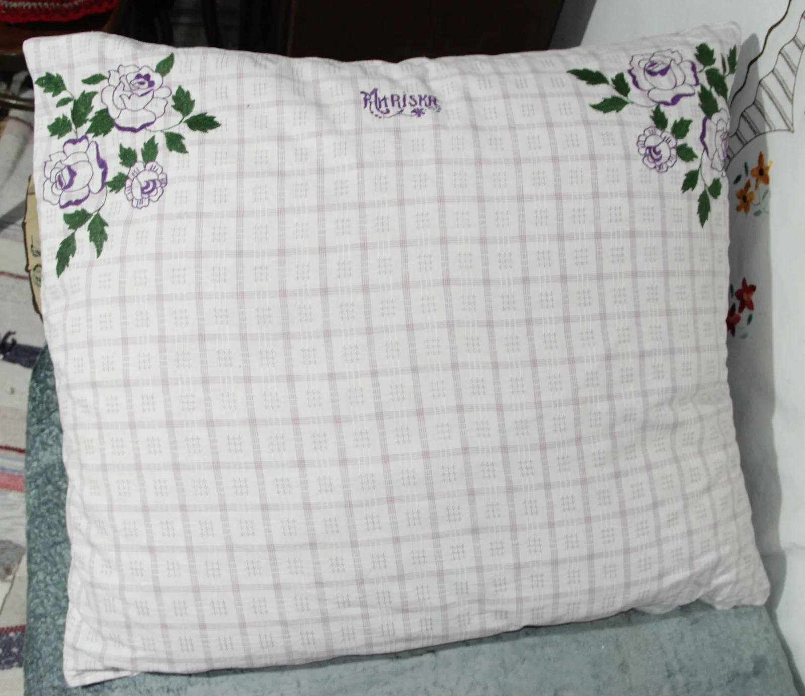Leírás: Az alapanyag szövésében lila és fehér. Két felső sarkában nagyméretű rózsamotívum levelekkel, hamislaposöltéssel hímezve. Színei lila és zöld. Felirata: „Mariska”.