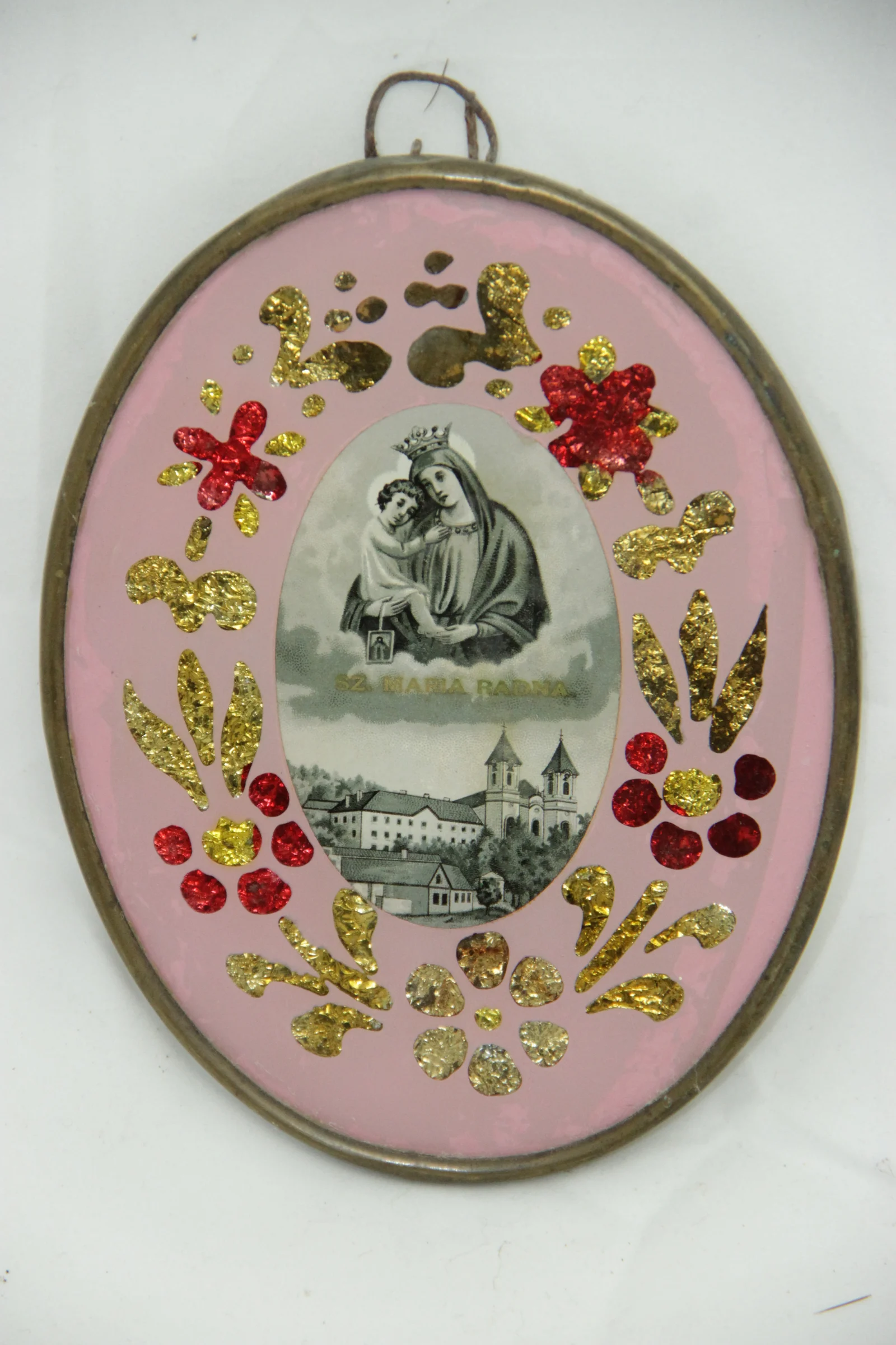 Leírás: Búcsús emlék. A képen a Szűzanya, karján a gyermek Jézussal, alatta a Máriaradnai kegyhely látképe. A keret hinterglas technikával díszített (arany és vörös fémes fóliából kialakított florális motívumok rózsaszín mezőbe foglalva). Felirat: "Sz. Mária Radna"
