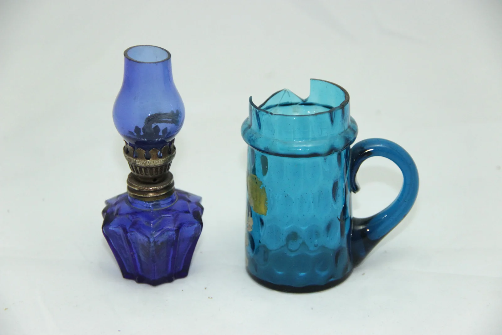 Leírás: A petróleumlámpa sötétkék, a üvegpohár türkizék. Tartálya csillag alakú. A pohár festett, pereme törött. A tetején van egy kiszélesedő perem.