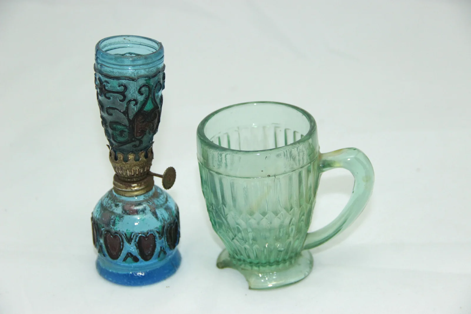 Leírás: A pohár bordázott mintájú, egyfülű. talpa csempe. Felirata: "A jó gyermeknek". A lámpa festett üvegből készült domborműves díszítéssel.