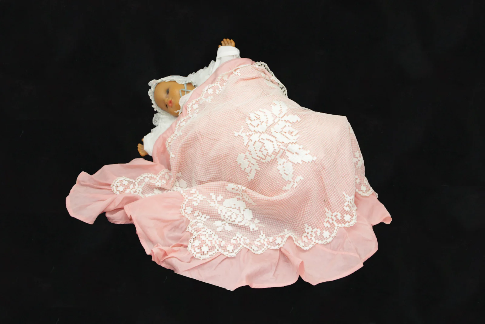Leírás: Rózsaszín selyem anyagból készült, rózsamotívumos necc-csipke rátéttel.