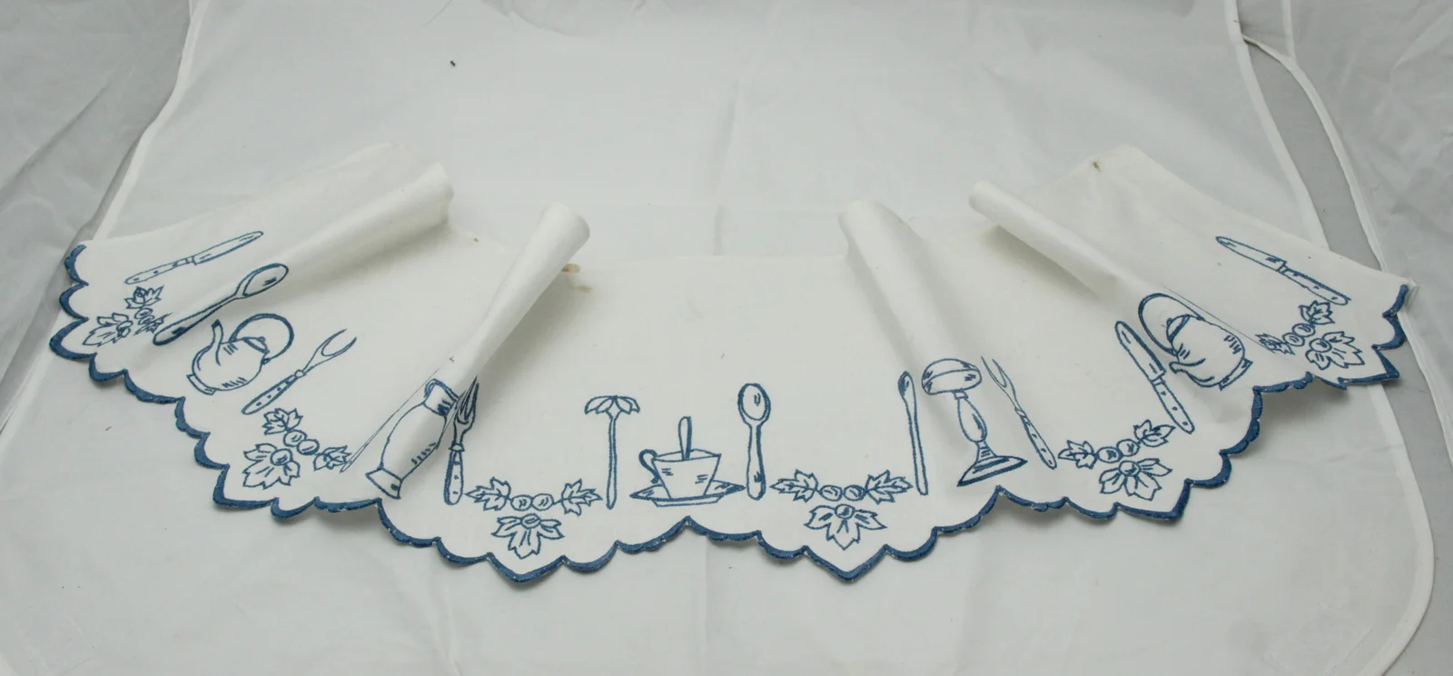 Leírás: Kék hímzőfonállal hímzett. Motívuma szőlőlevelek és konyhai eszközök.
