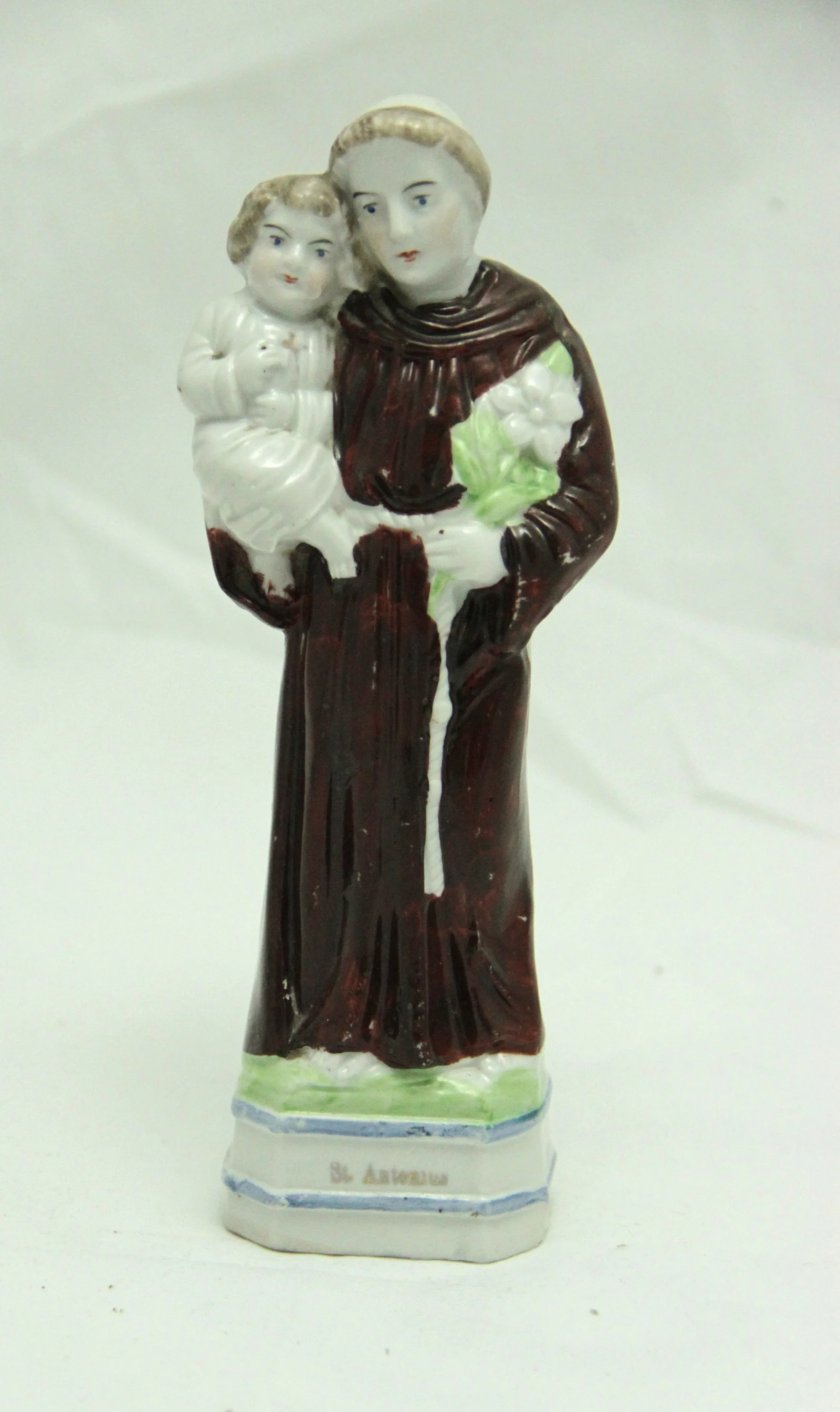 Leírás: Festett porcelánszobor. Felirata: "St Antonius". Talpán két kék csík található.