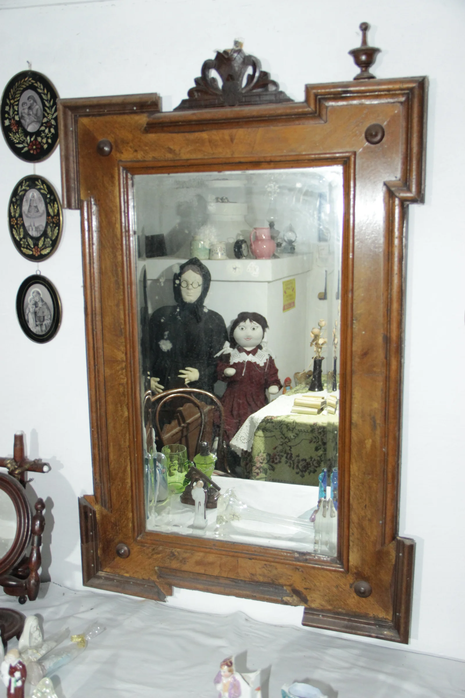 Leírás: Metszett tükör széles, díszes fakeretben. Tetején faragott, koronára emlékeztető, stilizált tulipánban végződő díszítmény. Jobb oldalán esztergált dísz (a bal oldaláról hiányzik). A tükörkeret négy sarkát egy-egy kerek fagomb disziti. Nem szabályos téglalap formájú, az oldalak közepén keskenyebb a ráma.