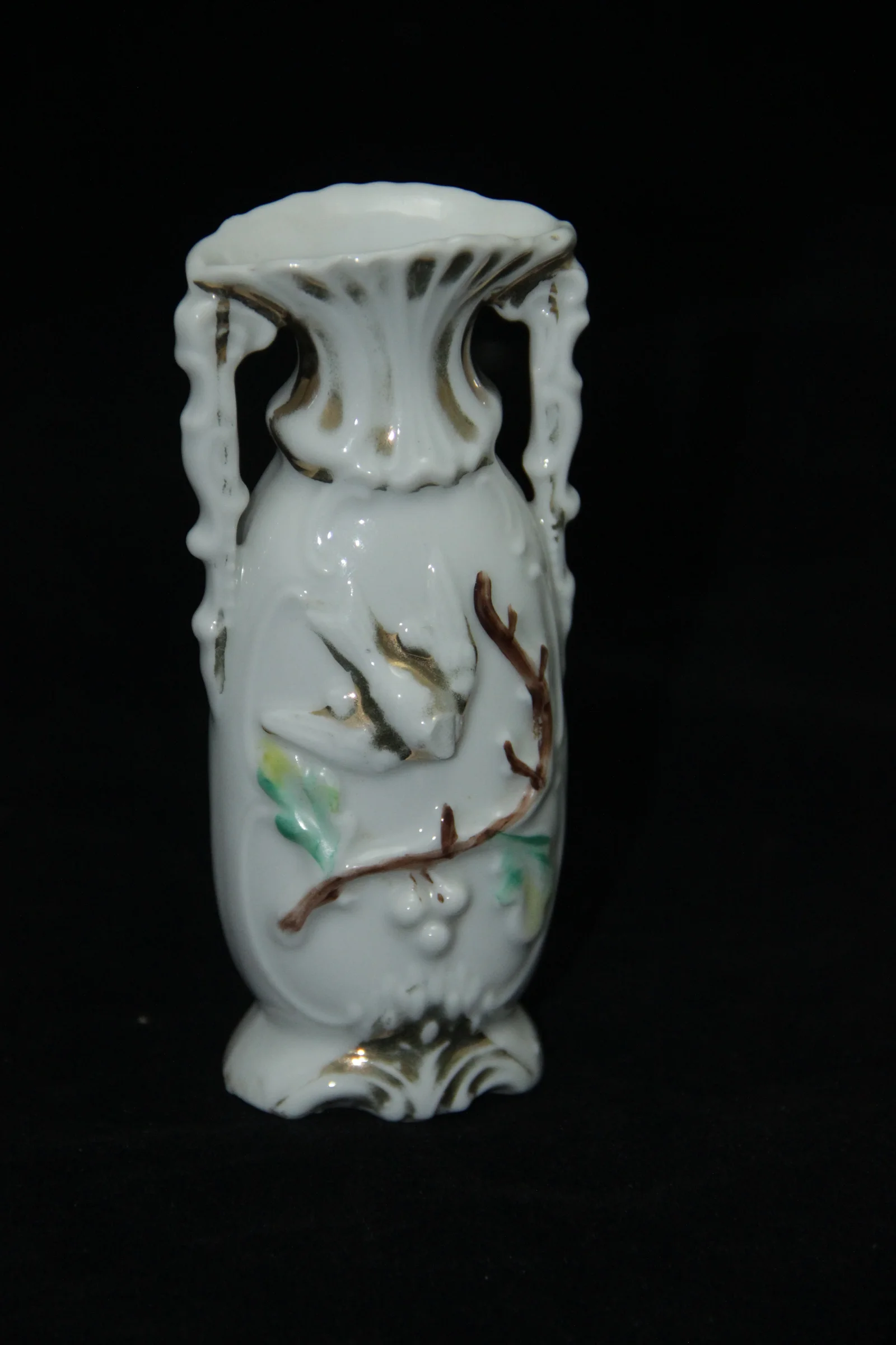 Leírás: Arany, barna, zöld, sárga színnel festett. A közepén kidomborodó dísz ágra szálló madarat ábrázol.