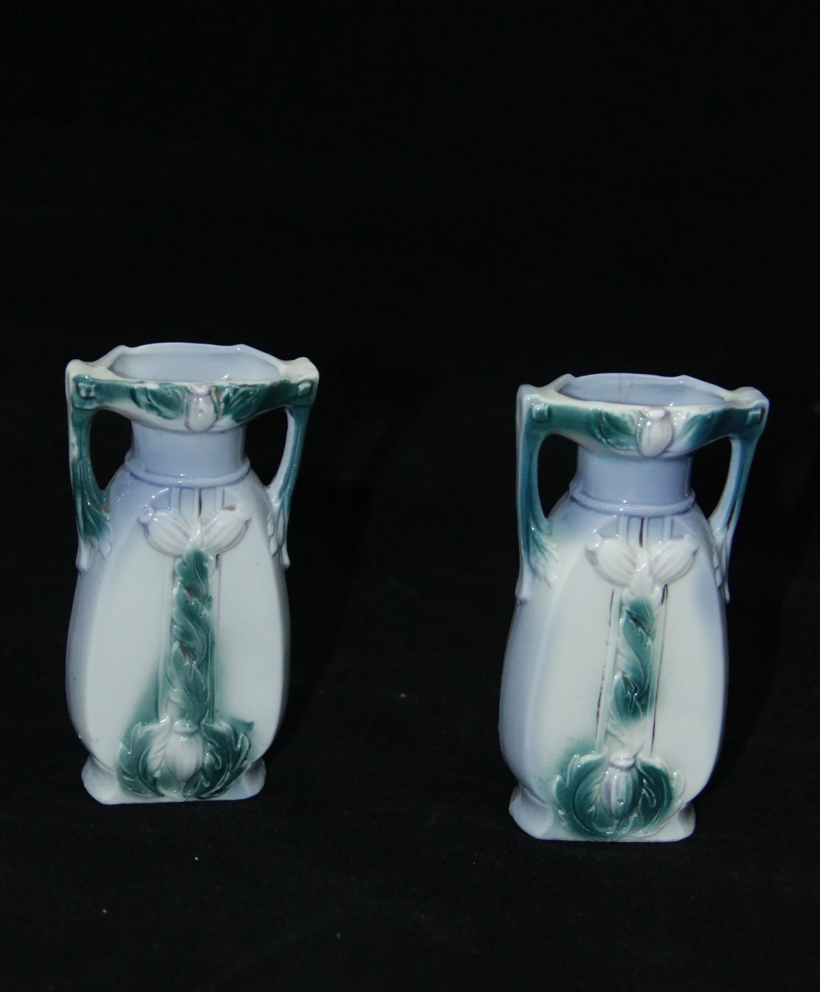 Leírás: 2 db festett porcelánváza, zöld és kék színűek. Díszítése az elején zöldre festett növényi ornamentika, kidomborodó. Két füle van. Számozása a hátán 1632.