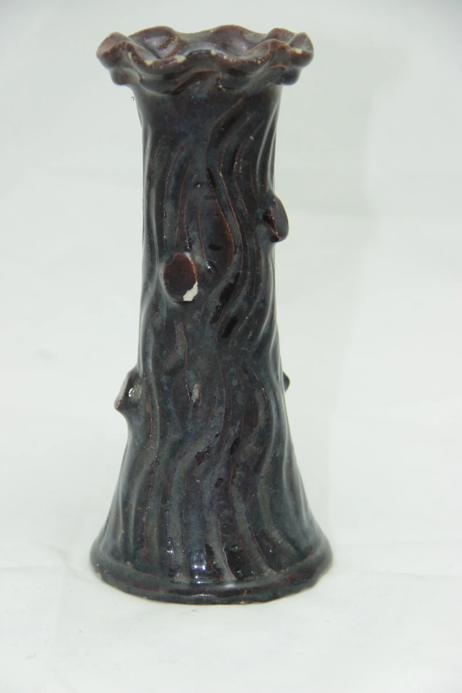 Leírás: Fatörzset imitáló váza. Előre bemázazták, így vajszínű lett a belseje, külseje sötétbarna mázzal fedett. Szája hullámcakkos.
