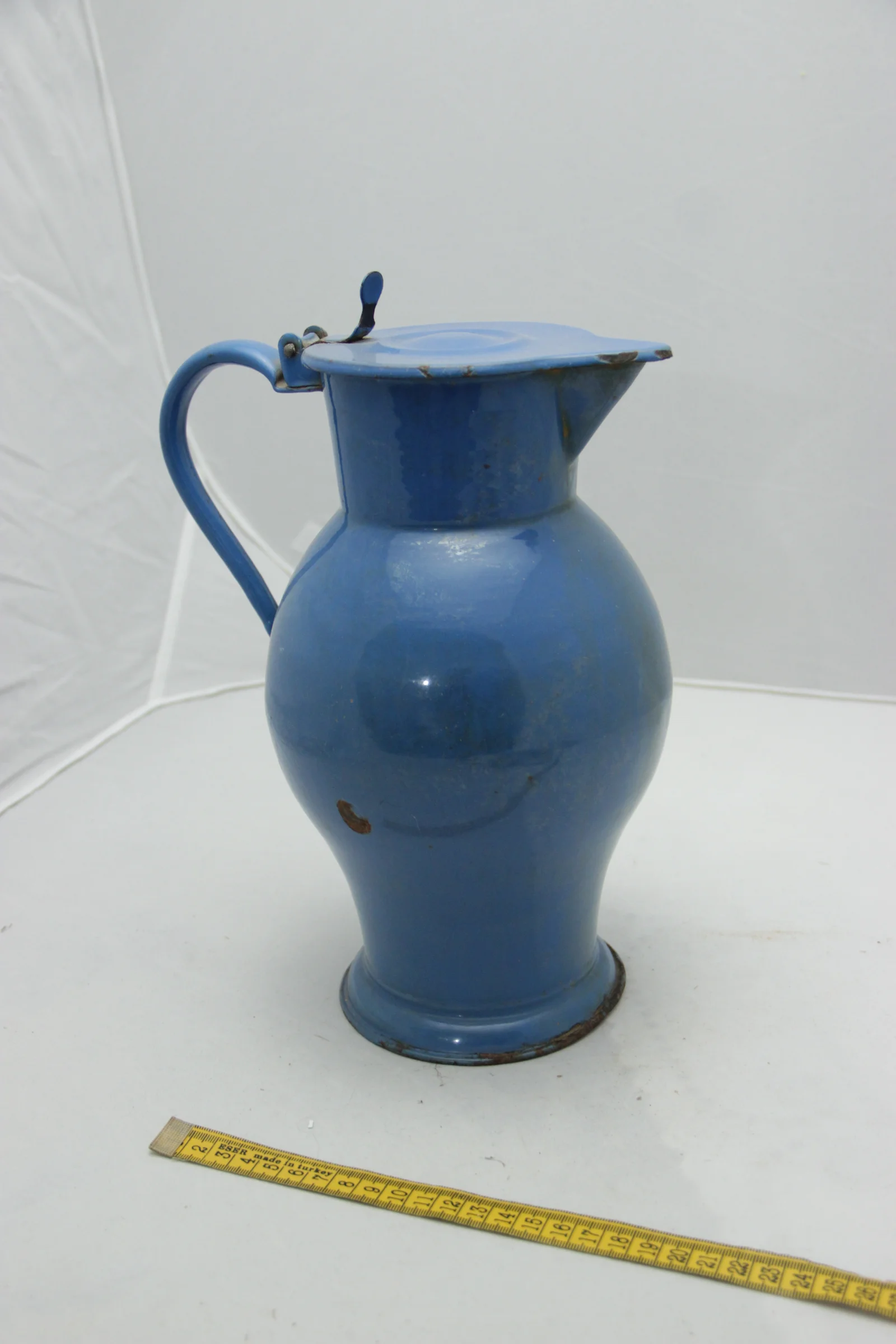 Leírás: Kék színű. Füles, födeles, csűcsös kialakítású.