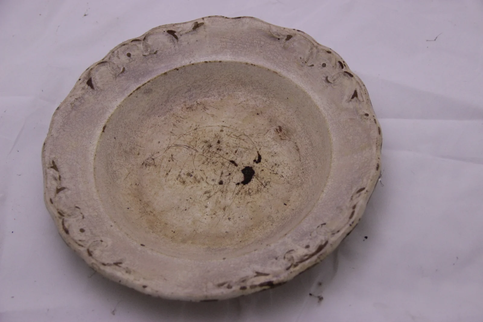 Leírás: Erősen kopott. Hurkolt szegélyű mintája van. Fenékjegye: "MAJOLIKA CELEJA"
