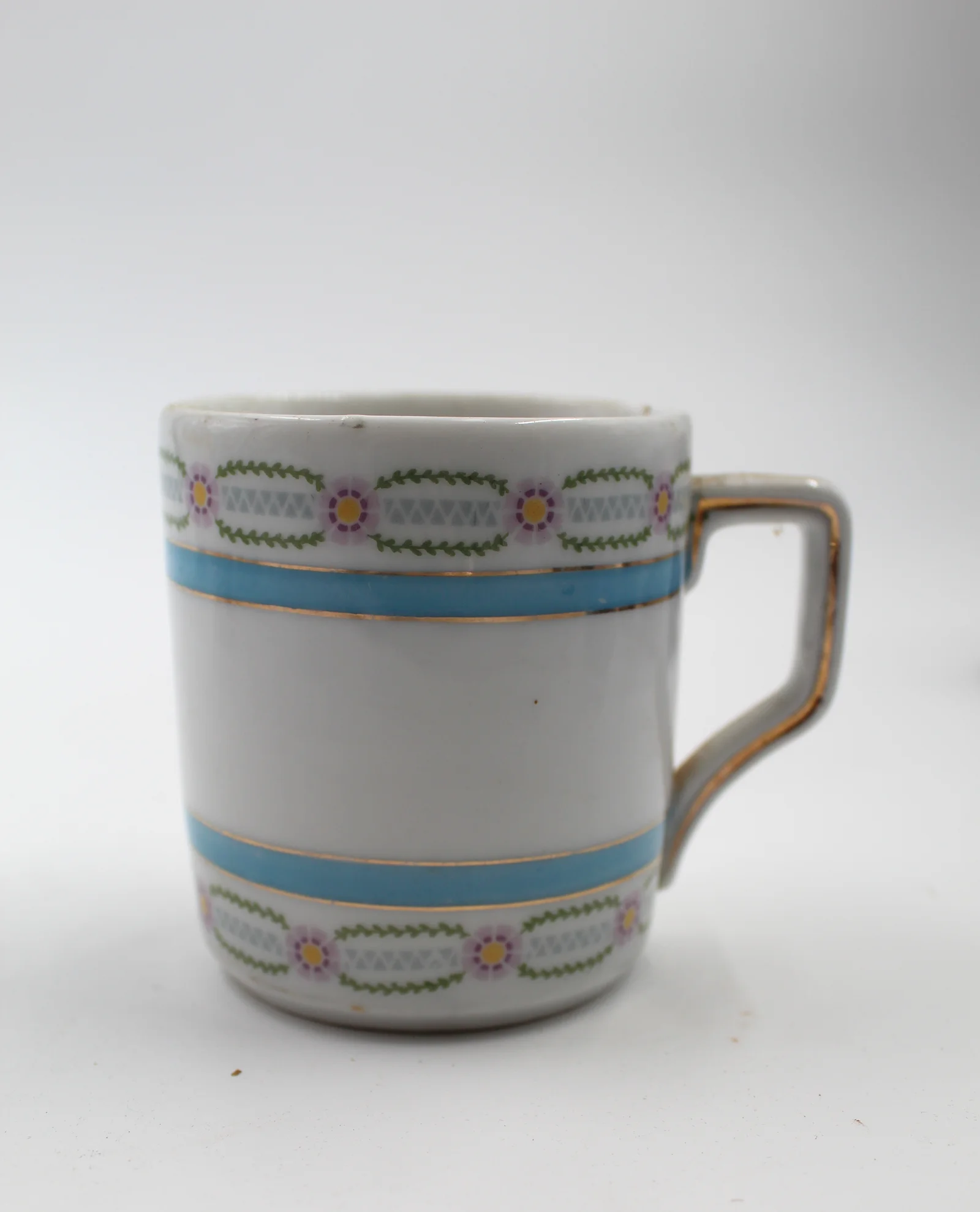 Leírás: Egyenesfalú, egyfülű, szájánál és talpánál koszorúmintás. Fenekén szám: 6547