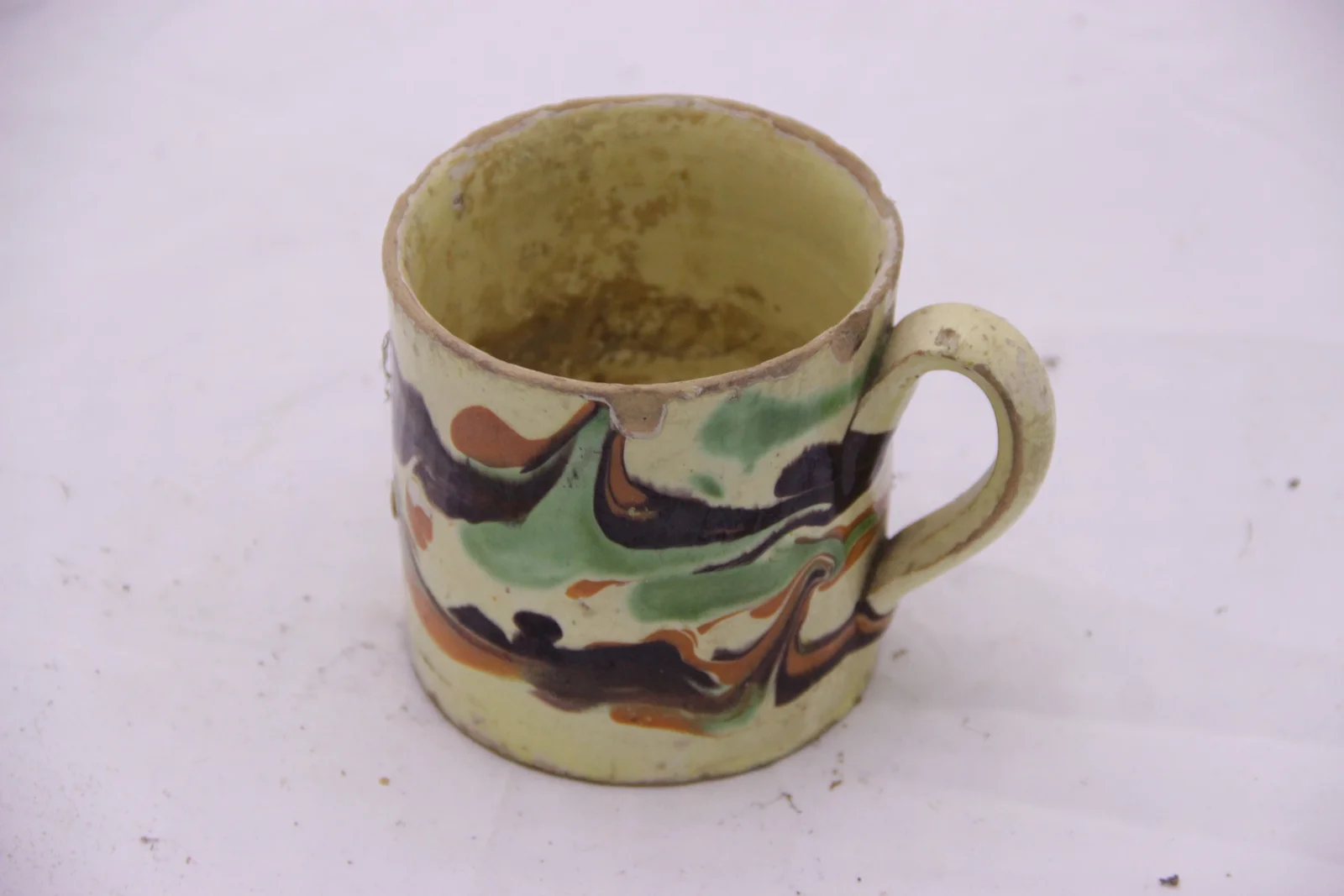 Leírás: Kívül belül mázas, folyatott mintával. Barna, zöld, sárga szinekkel. Füle a nyaktól indul. Egyenes vonalú a bögre formája.