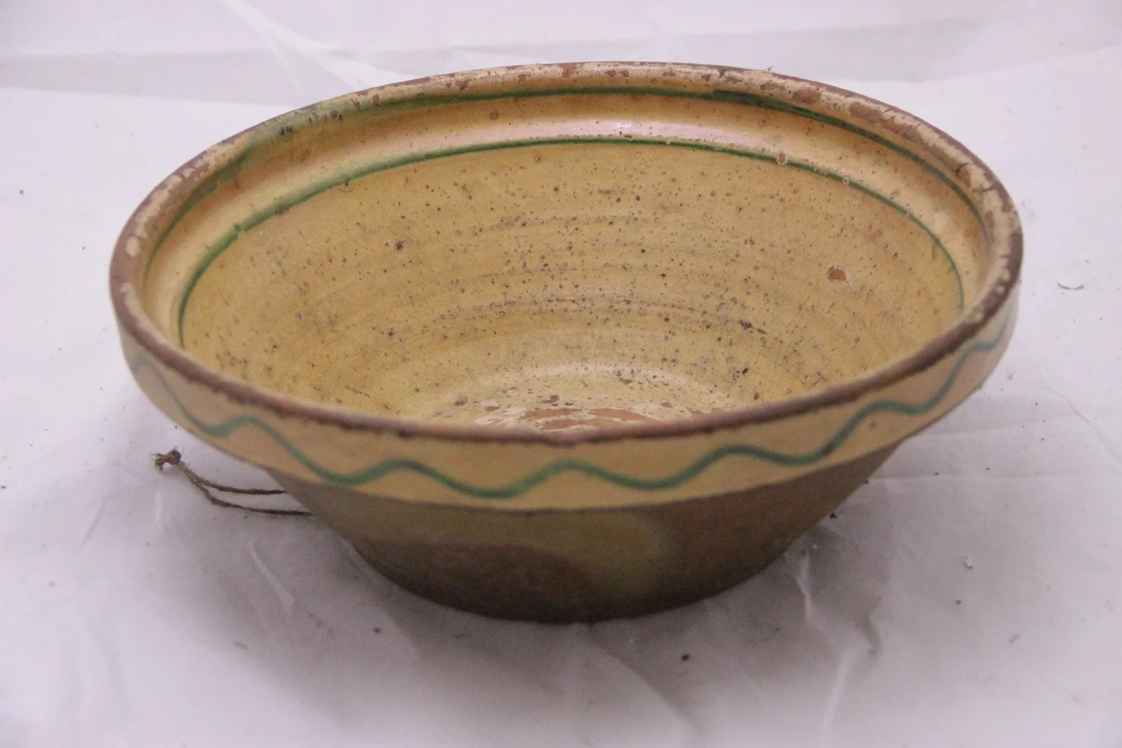 Leírás: Van akasztója. Kivül mázatlan. Belseje mázas, vajszinű. A szájperem alatt két zöld csik, a külső peremen zöld hullámvonal.