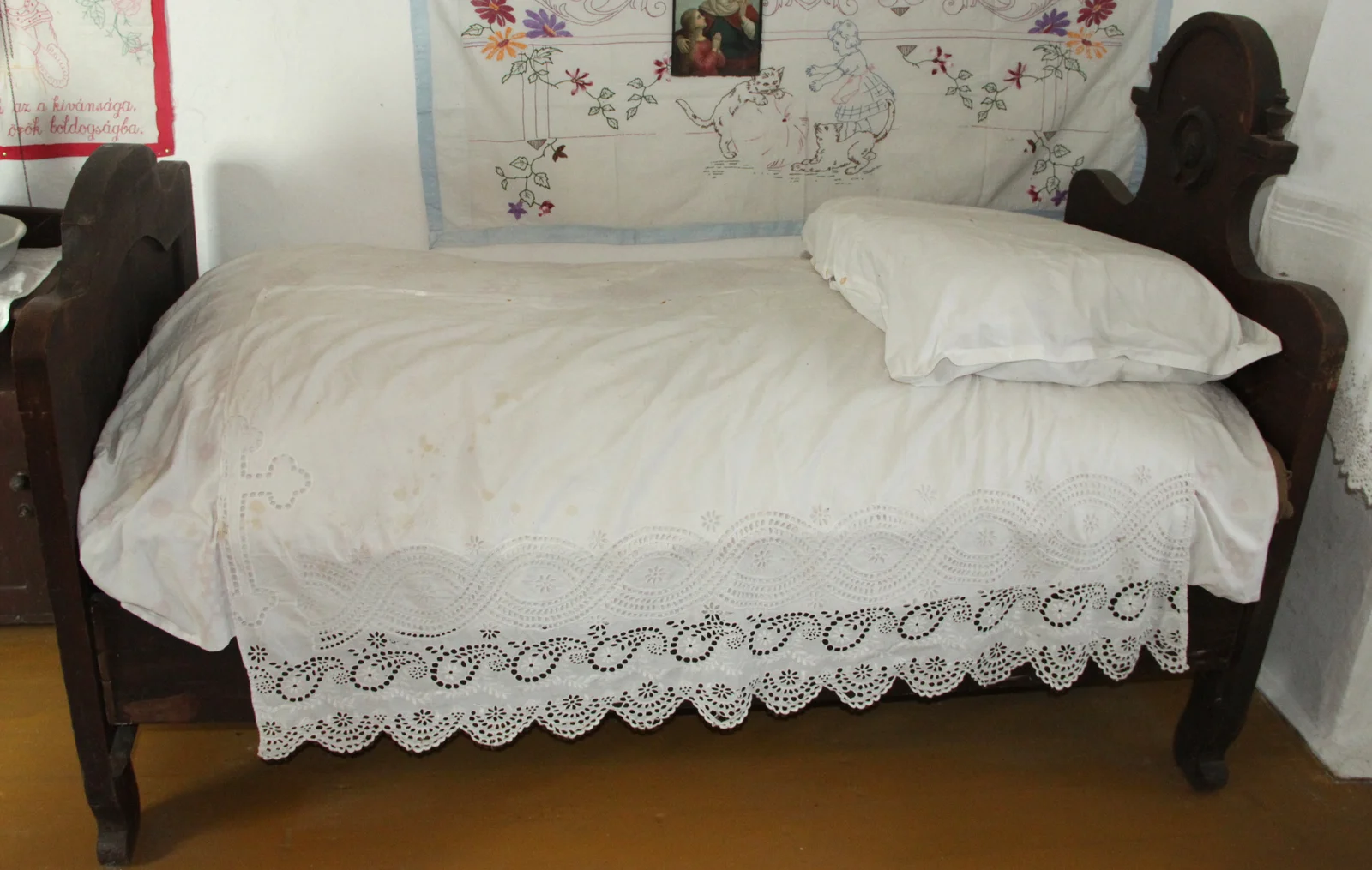 Leírás: Feltételezhetően oltárterítőnek készült és később félbevágták, hogy lepedőként használják. Díszítménye széles sávban elhelyezett, gazdag lyukhímzéses minta, valamint egy nagyméretű kereszt, amely félbe van vágva. Felirata: "Ónozó Ferenczné"