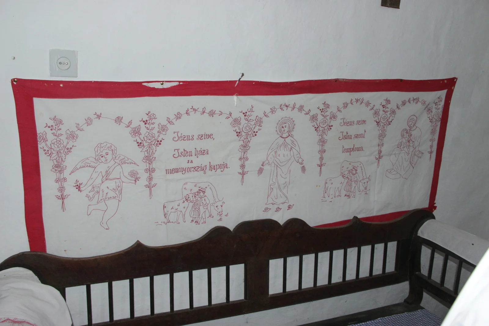 Leírás: Piros himzőszállal. Felirata: " Jézus szive Istán háza s a menyország kapuja" "Jézus szive Isten szent temploma" Motivumai: puttó, tehenet legeltető gyerekek, Szűz Mária, Szent József a gyermek Jézussal. Rózsafüzérek tagolják a figurákat.