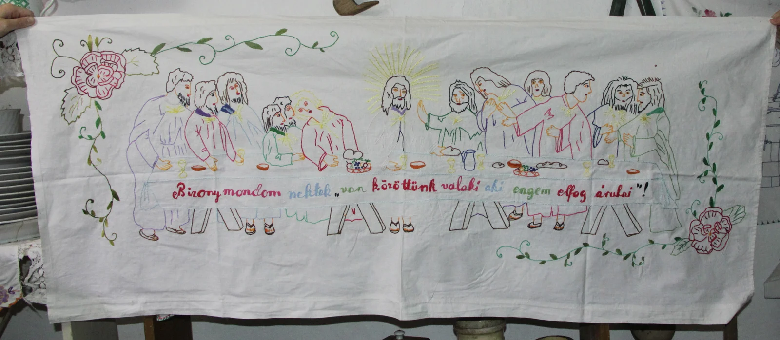 Leírás: Az utolsó vacsorát ábrázoló falvédő. Piros, lila, kék, zöld, barna, sárga hímzőszállal hímezve. Felirata: "Bizony mondom nektek »van közöttünk valaki aki engem el fog árulni«!"